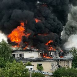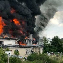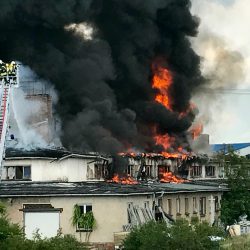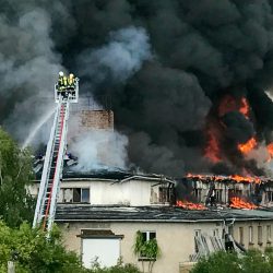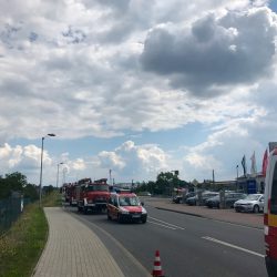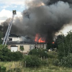 Neben den Feuerwehren Waren, Groß Plasten und Malchow sind auch Rettungskräfte des DRK im Einsatz. Ersten Erkenntnissen zufolge sollen auf dem Dach Schweißarbeiten ausgeführt worden seien.