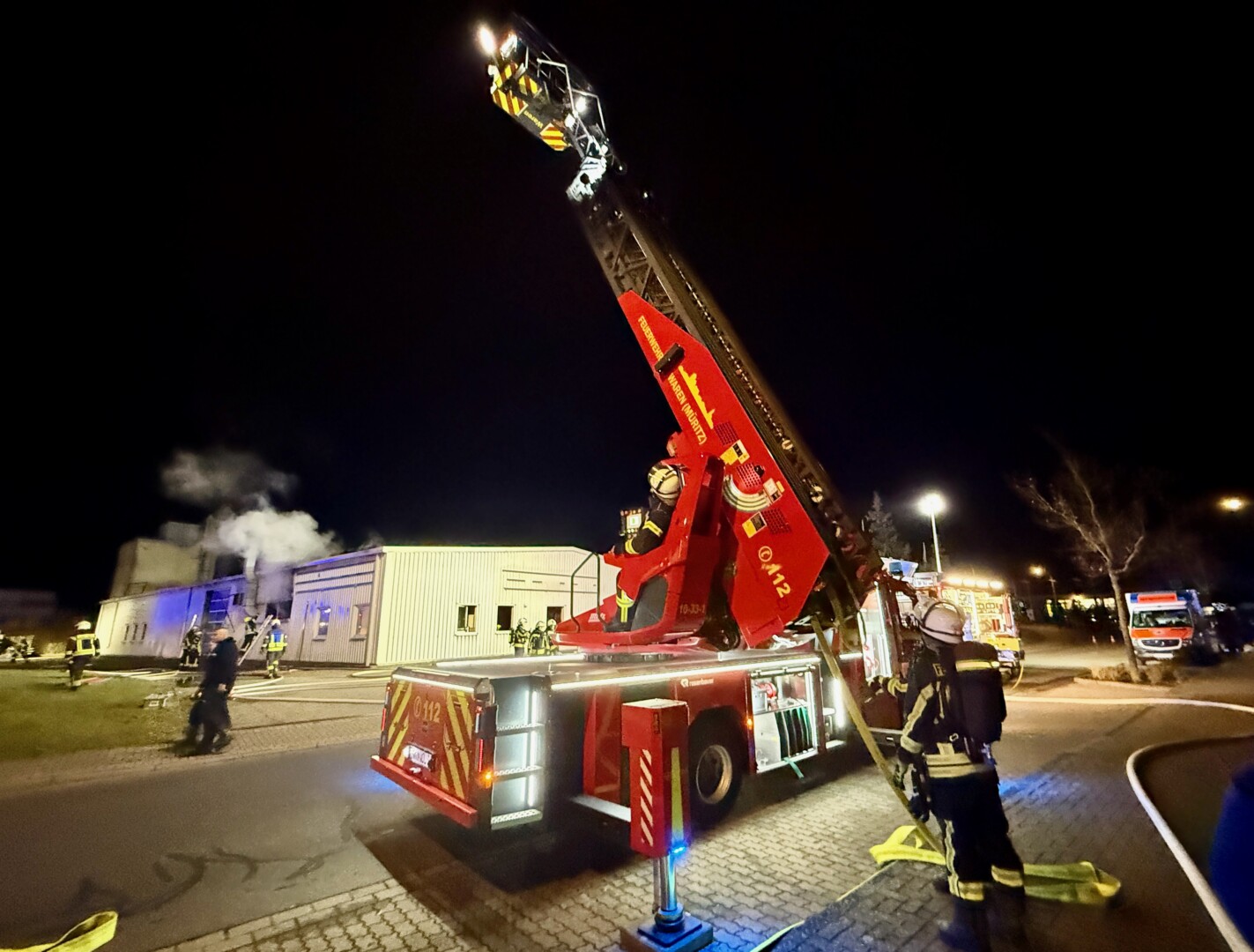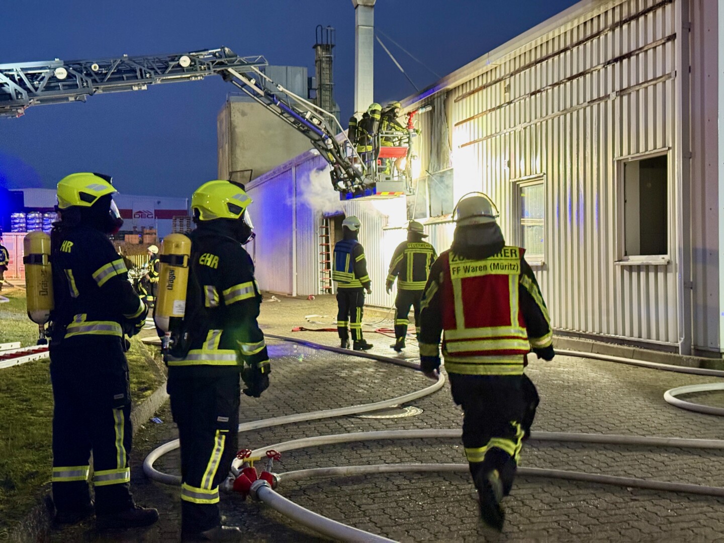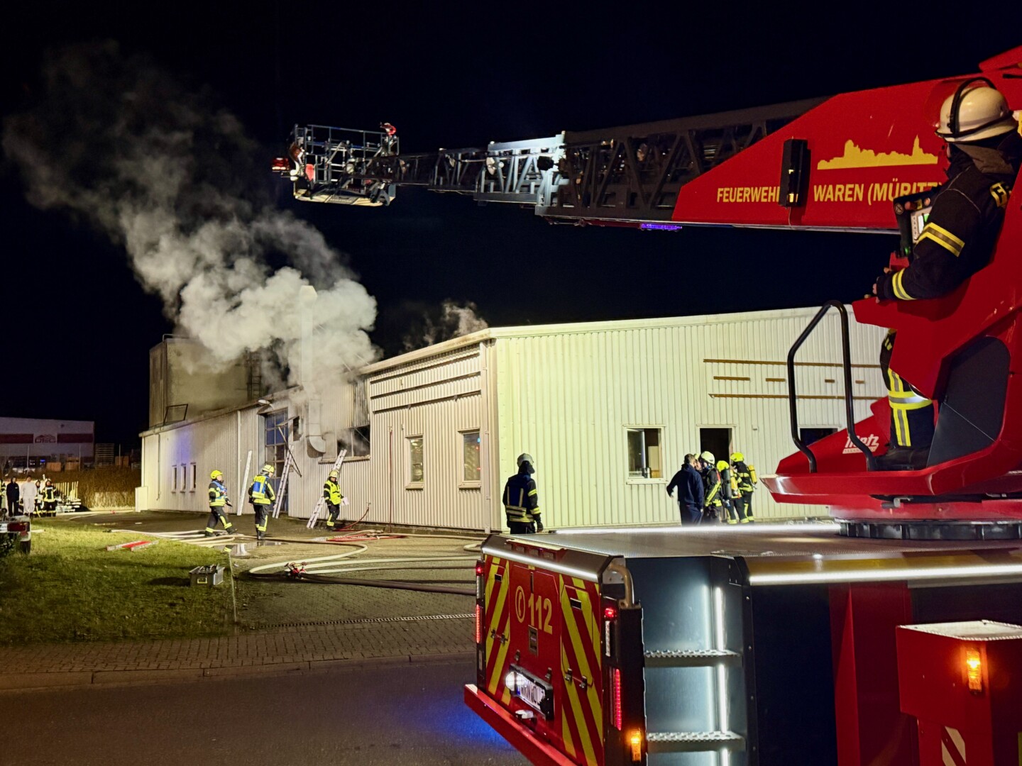 Das wird noch länger dauern: Seit etwa 5.30 Uhr sind rund 60 Feuerwehrleute im Gewerbegebiet Ost in Waren im Einsatz. In einer Möbelmanufaktur ist im Bereich des Holzlagers, in dem auch Lacke und Farben liegen, ein Brand ausgebrochen.