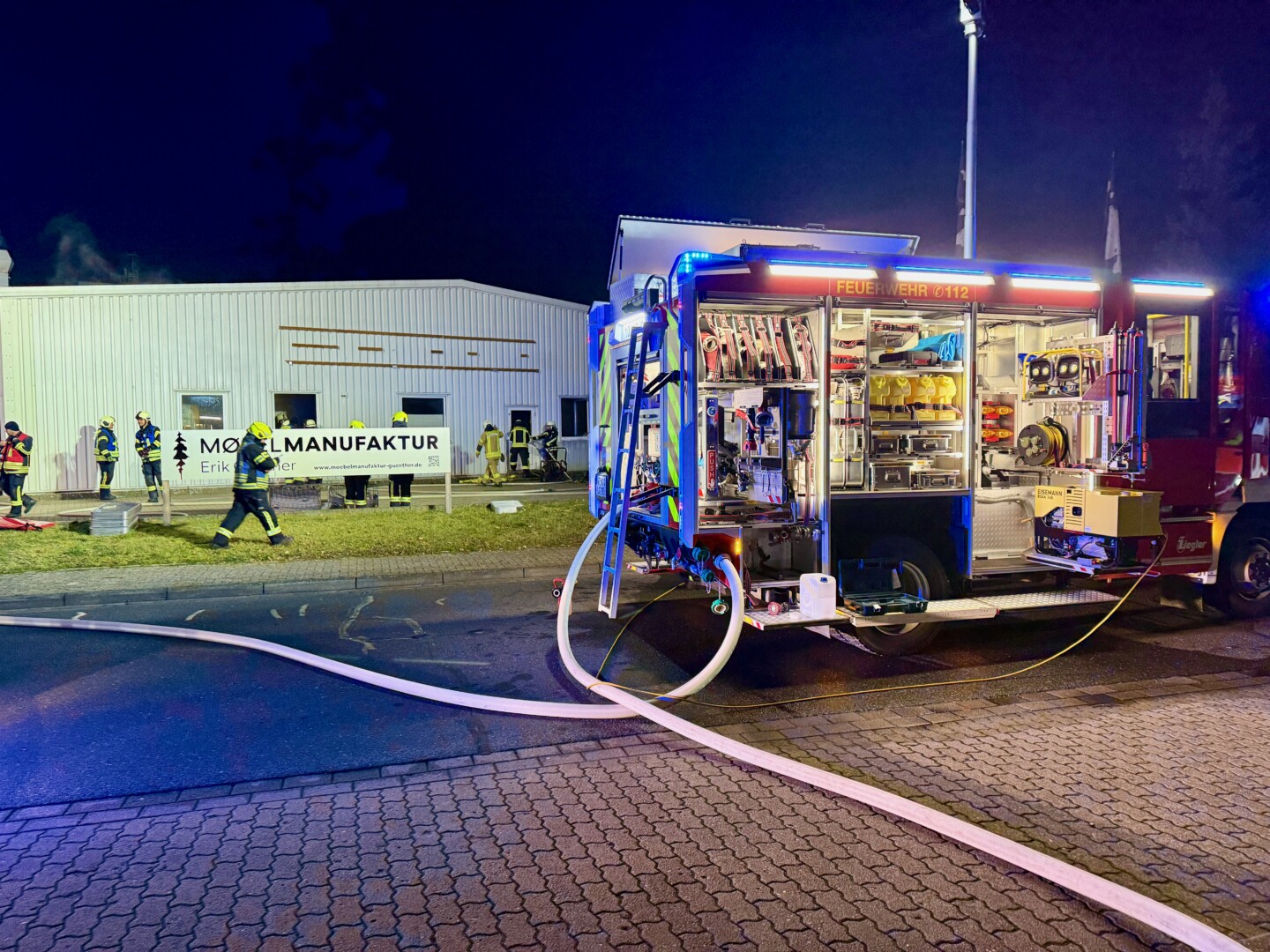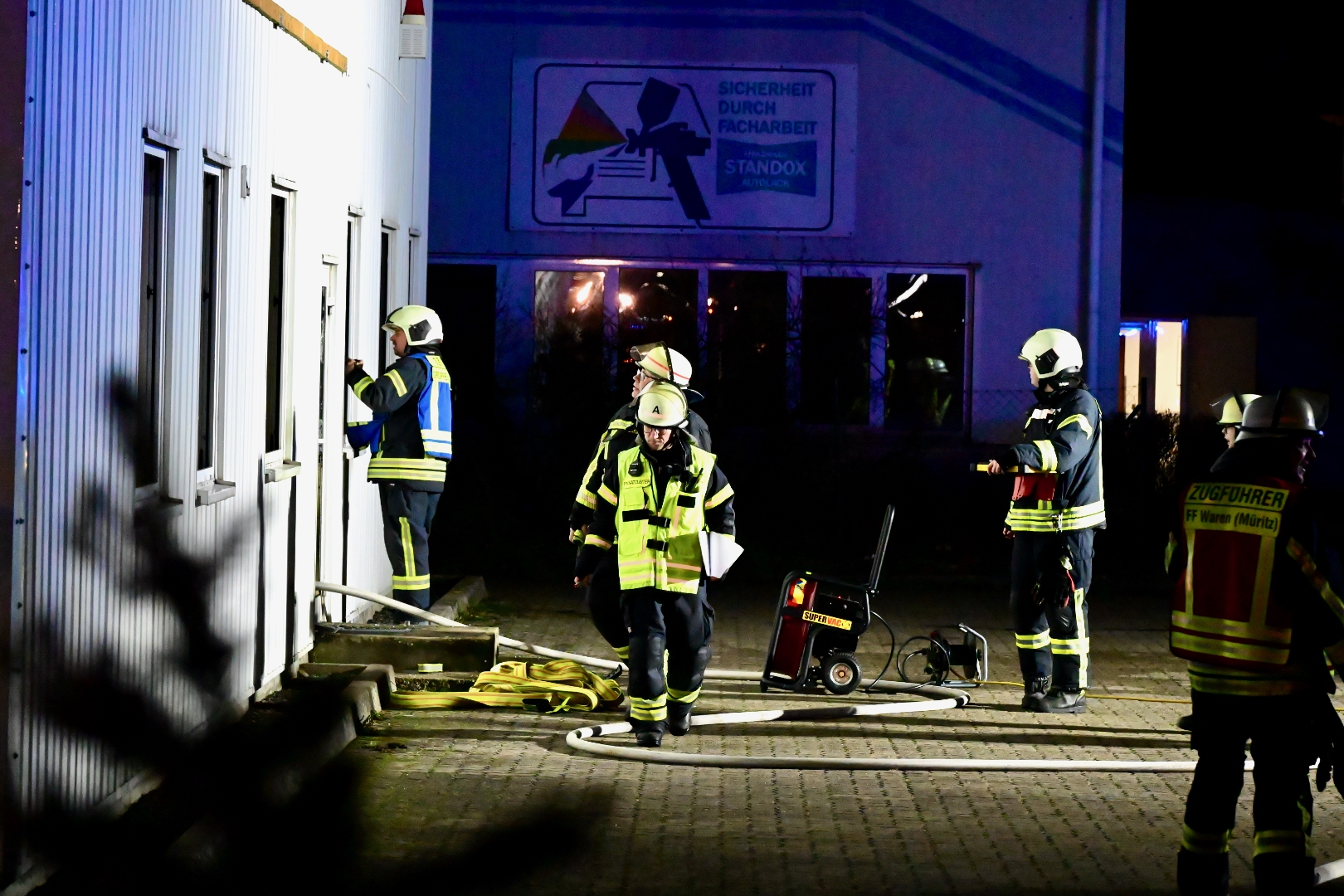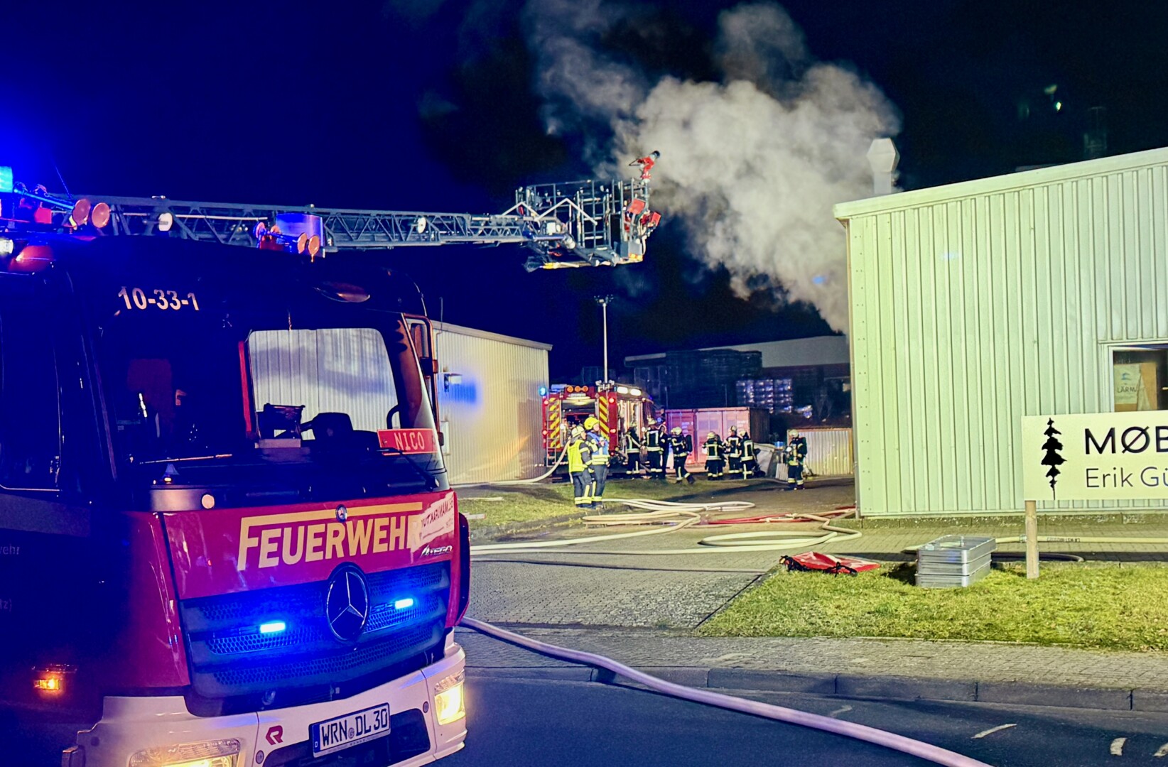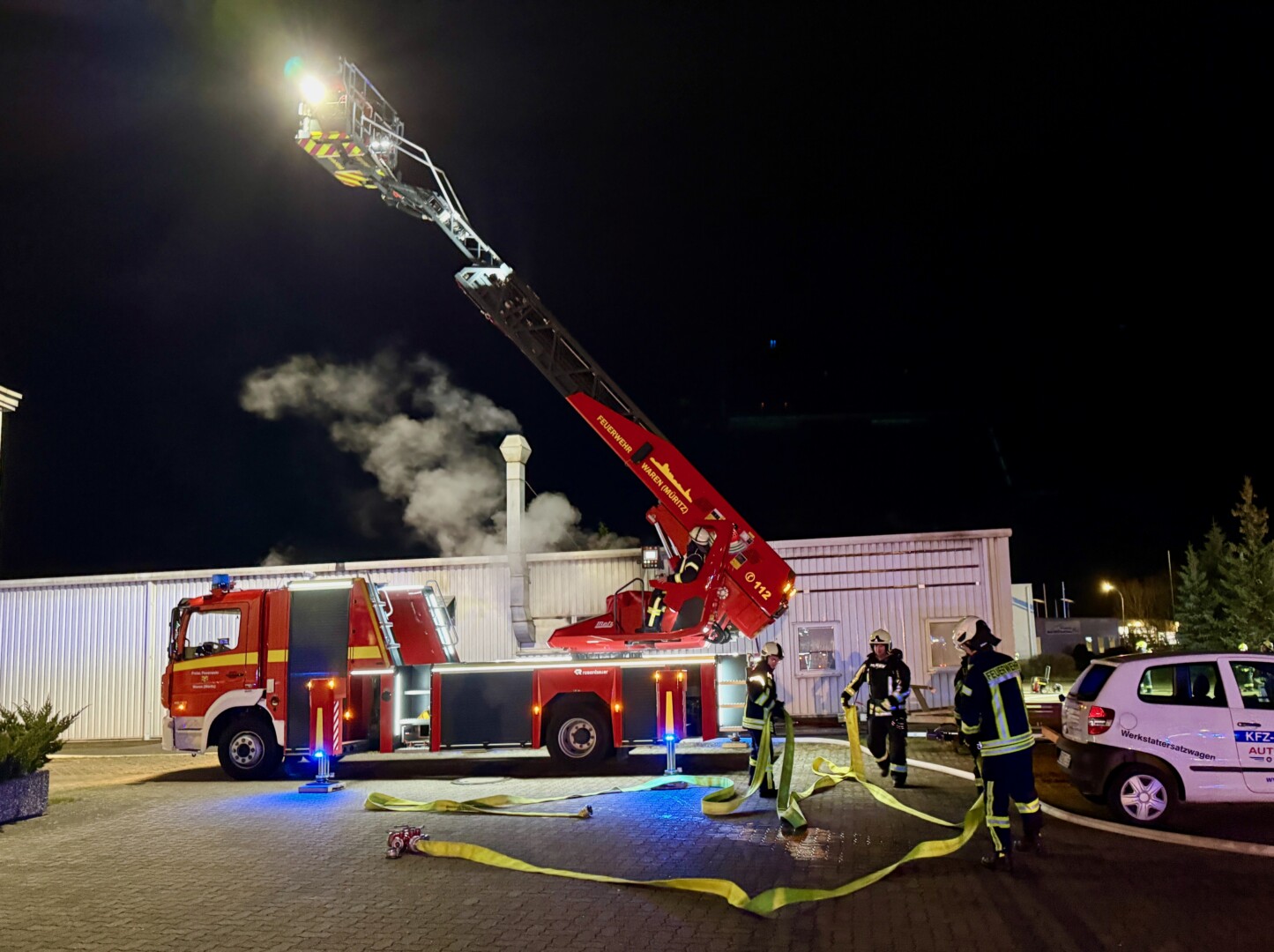 Das wird noch länger dauern: Seit etwa 5.30 Uhr sind rund 60 Feuerwehrleute im Gewerbegebiet Ost in Waren im Einsatz. In einer Möbelmanufaktur ist im Bereich des Holzlagers, in dem auch Lacke und Farben liegen, ein Brand ausgebrochen.