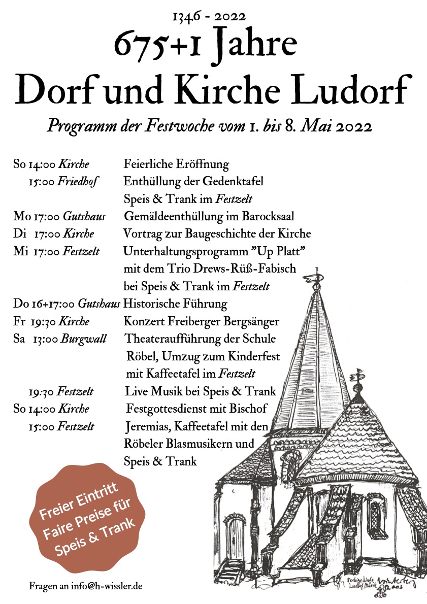 Die Gemeinde Südmüritz und die Kirchengemeinde Röbel laden zu einer gemeinsam veranstalteten Festwoche nach Ludorf ein. Ludorf wurde erstmalig am 8. Mai 1346 mit der Weihe der Kirche durch den Bischof Burchard von Havelberg urkundlich erwähnt. Die bereits im vergangenen Jahr vorbereiteten Feierlichkeiten mussten Corona bedingt abgesagt werden. Umso mehr freut es das Organisationsteam, diese jetzt umsetzen zu können. Das Programm hält für alle Altersgruppen etwas bereit. Jedermann ist eingeladen, mit den Ludorfern zu feiern.