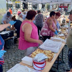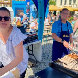 2565 Euro sind heute beim „Gemeinsamen Tafeln“ auf dem Neuen Markt zusammengekommen – Geld, das die „Warener Tafel, die derzeit um die 750 Menschen pro Woche in der Müritz-Region mit Lebensmitteln versorgt, dringend braucht. Denn wie Tafel-Chef André Rath bestätigte, wird es immer schwieriger, genügend Lebensmittel zu „besorgen“, auch das Spendenaufkommen geht zurück. „Dass die Menschen ihr Geld zusammenhalten, Firmen in der augenblicklichen Situation mit sich zu tun haben und Privatleute Angst vor dem haben, was in Sachen Energie noch auf sie zukommt, spüren wir deutlich“, so Rath. Um so größer die Freude über das heutige Spenden-Ergebnis. Der Neue Markt war trotz der hohen Temepraturen und der Tische in der prallen Sonne bestens besucht.