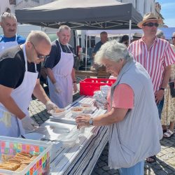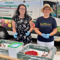 Damit das möglich ist, sind ganz viele Helfer und Sponsoren nötigt. So hat das Blaue Kreuz Zentrum Zahren leckeren Gulasch und Nudeln serviert, das von Robert Bluhm zubereitete 60-Kilo-Wildschwein des Jagdverbandes Müritz ging weg, wie die sprichwörtlichen warmen Semmeln. Nach knapp einer Dreiviertelstunde war alles weggeputzt. Der Warener Fruchthandel bot leckeren Obstkuchen an, Getränke kamen vom Seehotel Ecktannen, und ehrenamtliche Helfer der Tafel haben Kuchen gebacken. Dazu gab’s einen kleinen Flohmarkt des Sozialladens.