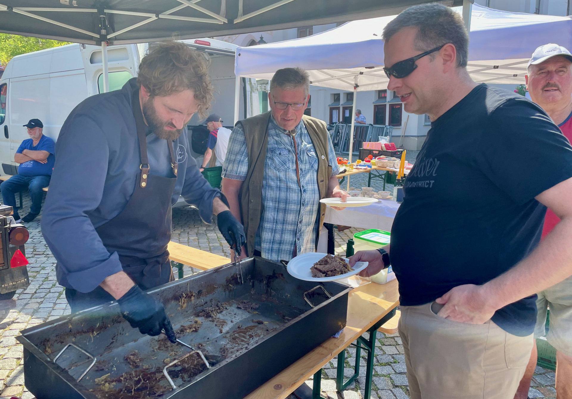 Auch Politiker der Region setzten sich an die lange Tafel, unter anderem Stadtpräsident Rüdiger Prehn, der zweite stellvertretende Bürgermeister Florian Tornow und FDP/MUG-Fraktionschef Toralf Schnur. Auch der einstige, langjährige Tafelchef Günther Hoffmann, ließ es sich nicht nehmen, vorbei zu schauen, denn das gemeinsame Essen auf dem Markt ist schließlich wie die gesamte „Warener Tafel“ sein „Baby“, das er großgezogen, erzogen und erwachsen gemacht hat.