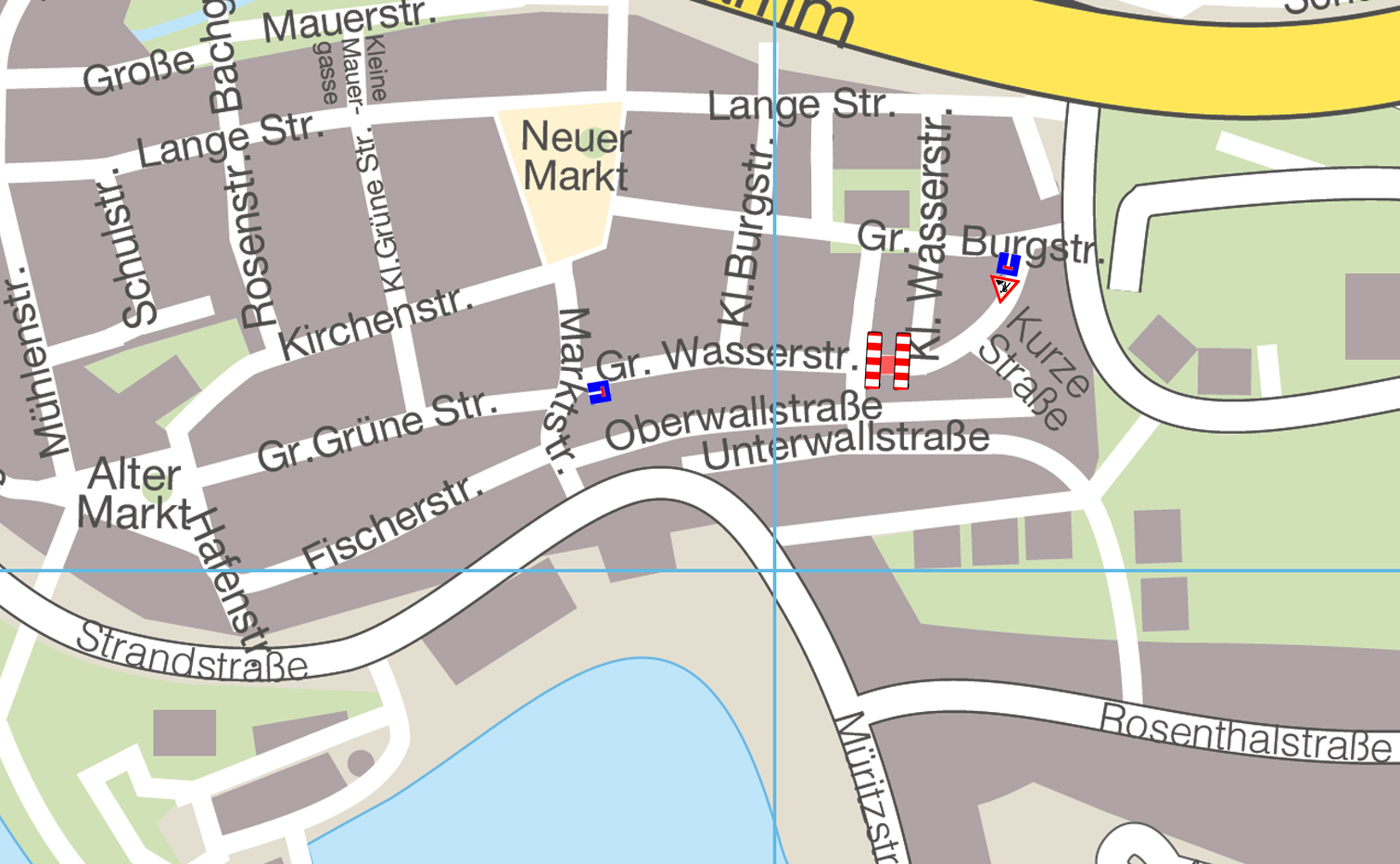 Für die Dauer der Maßnahme wird die bestehende Einbahnstraßenregelung aus Richtung Große Burgstraße sowie zwischen der Kleinen Burgstraße und Burggasse in der Großen Wasserstraße aufgehoben. Verkehrsteilnehmer werden gebeten den gesperrten Bereich über die Kleine Burgstraße und die Kleine Wasserstraße zu umfahren.