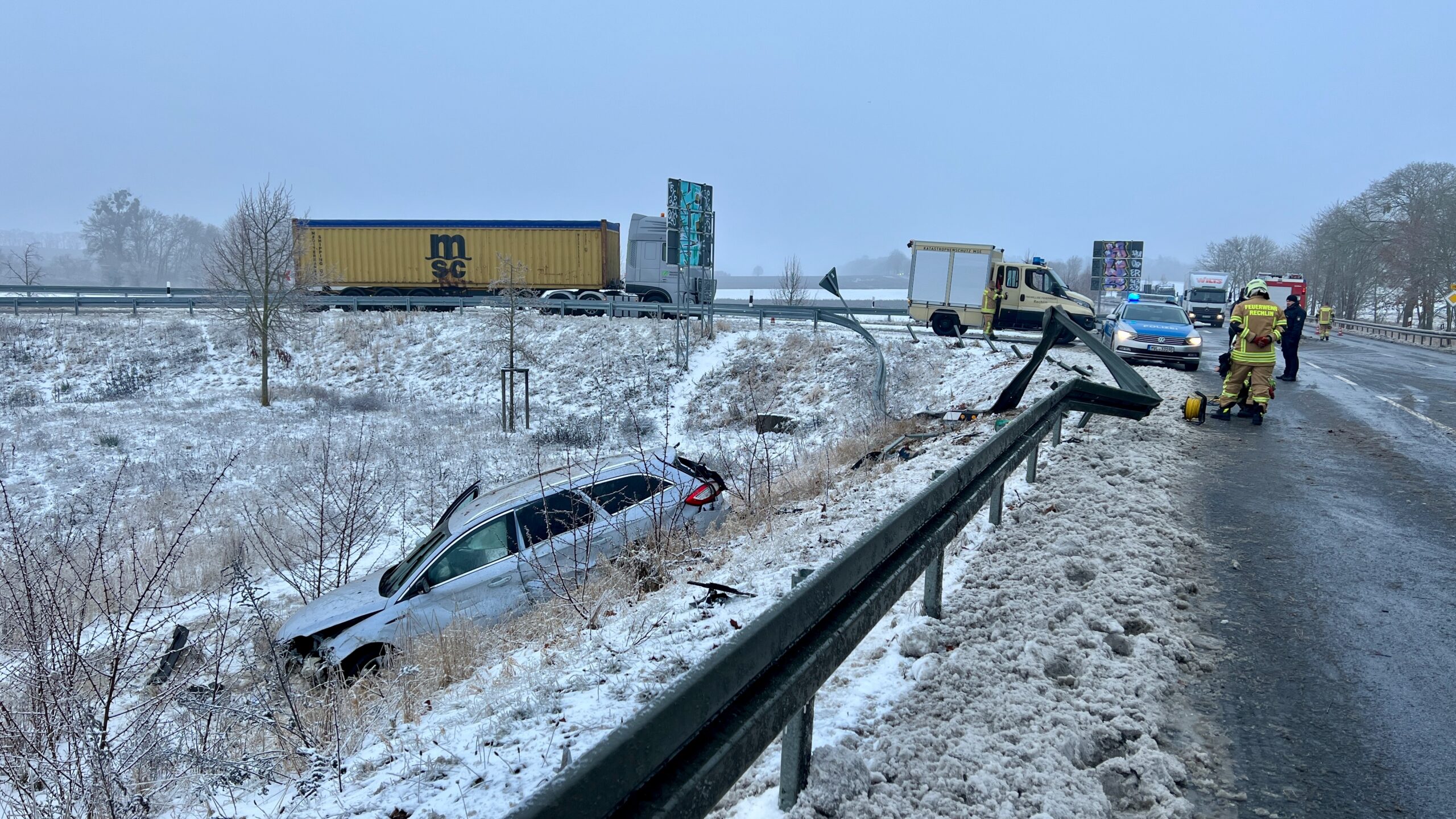 An der Unfallstelle waren Kräfte der Polizei, der Feuerwehr Rechlin und Lärz sowie ein Rettungswagen und ein Notarzt im Einsatz. Für die Dauer der Unfallaufnahme musste die B198 vollständig gesperrt werden. Die Bergung des Fahrzeugs erfolgte durch den ADAC.