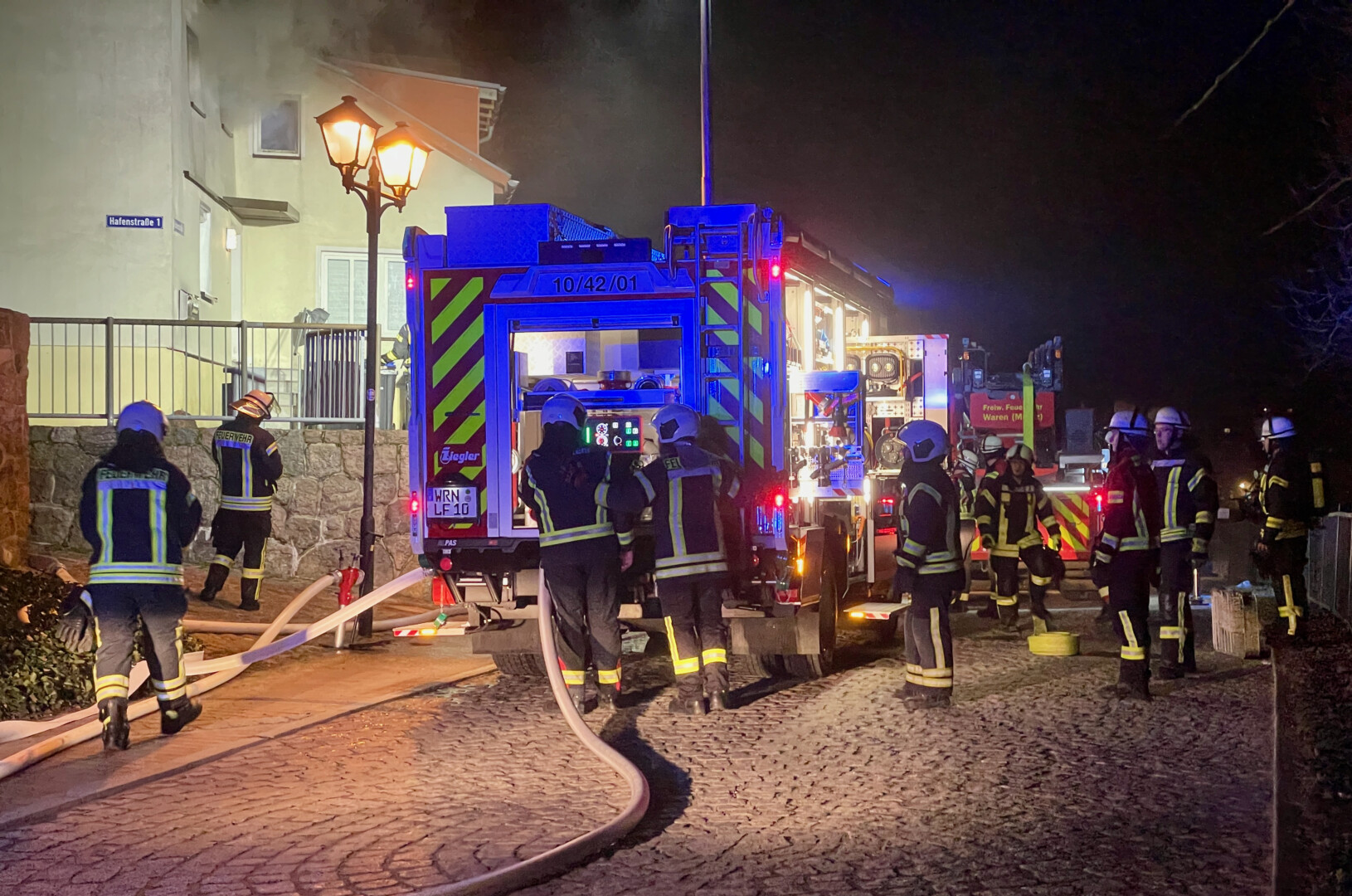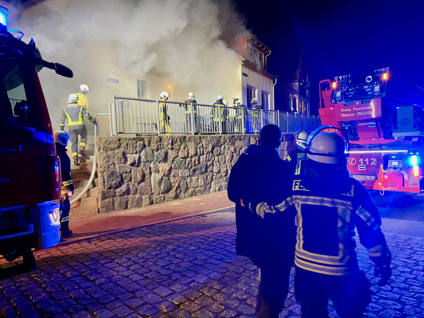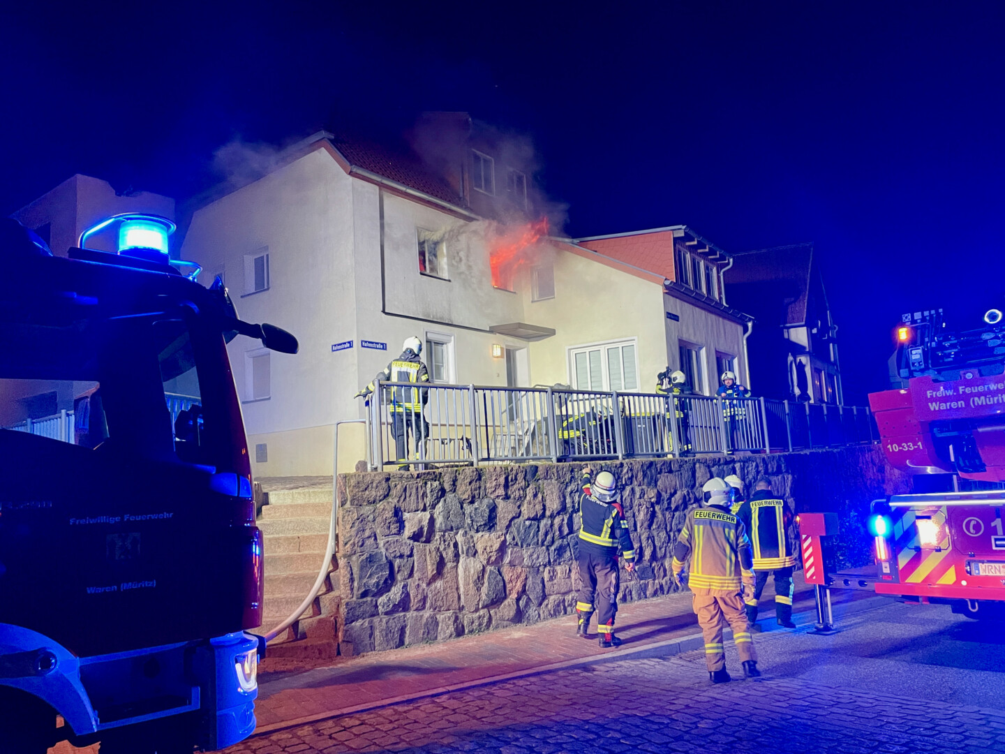 Als Warens Feuerwehrleute heute kurz vor 22 Uhr in der Hafenstraße eingetroffen sind, schlugen bereits Flammen aus dem Fenster: In der Wohnung eines jungen Mannes war ein Brand ausgebrochen, ersten Informationen zufolge in der Küche.