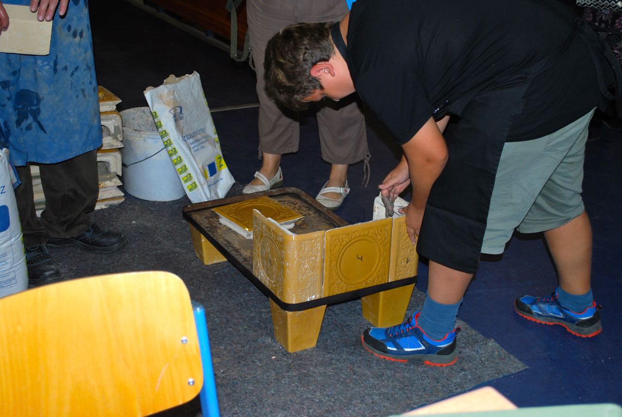 Einige Handwerksmeister gaben den Kindern und Jugendlichen die Möglichkeit, sich im Umgang mit Werkzeugen und Werkstoffen zu probieren. So zum Beispiel bei Dachdeckermeister Thomas Müller, der Tischlerei Brümmer, Malermeister Rassmann und dem Ofenbaumeister Jens Cordes. Schnell war die anfängliche Scheu überwunden und der Umgang mit Hammer und Nagel oder Schiefer wurde getestet, die Schürze umgebunden und mit Lehm gelang das Aufsetzen von Ofenkacheln.