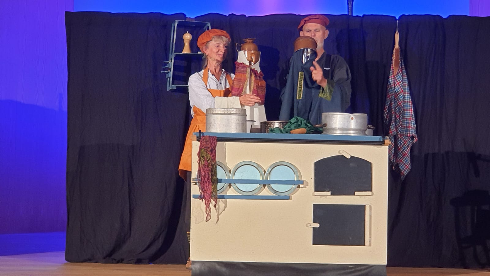 Am Nachmittag wurde die Geschichte von Dornröschen erzählt und zwar aus erster Hand: Der königliche Koch und sein Küchenjunge waren gemeinsam mit der Prinzessin aus dem 100-jährigen Schlaf erwacht und konnten sich noch sehr genau erinnern, was damals passierte. Mit Bürsten und Besen, Töpfen und Pfannen, Deckeln und Kannen spielte das Musiktheater Cammin das Märchen nach und inspirierte so manch kleinen Besucher zum Nachahmen in der heimischen Küche. Die Musik und alle Geräusche der Inszenierung waren auf kreative Weise handgemacht von der Sängerin Janina Howitz und dem Komponisten Siegfried Weber.