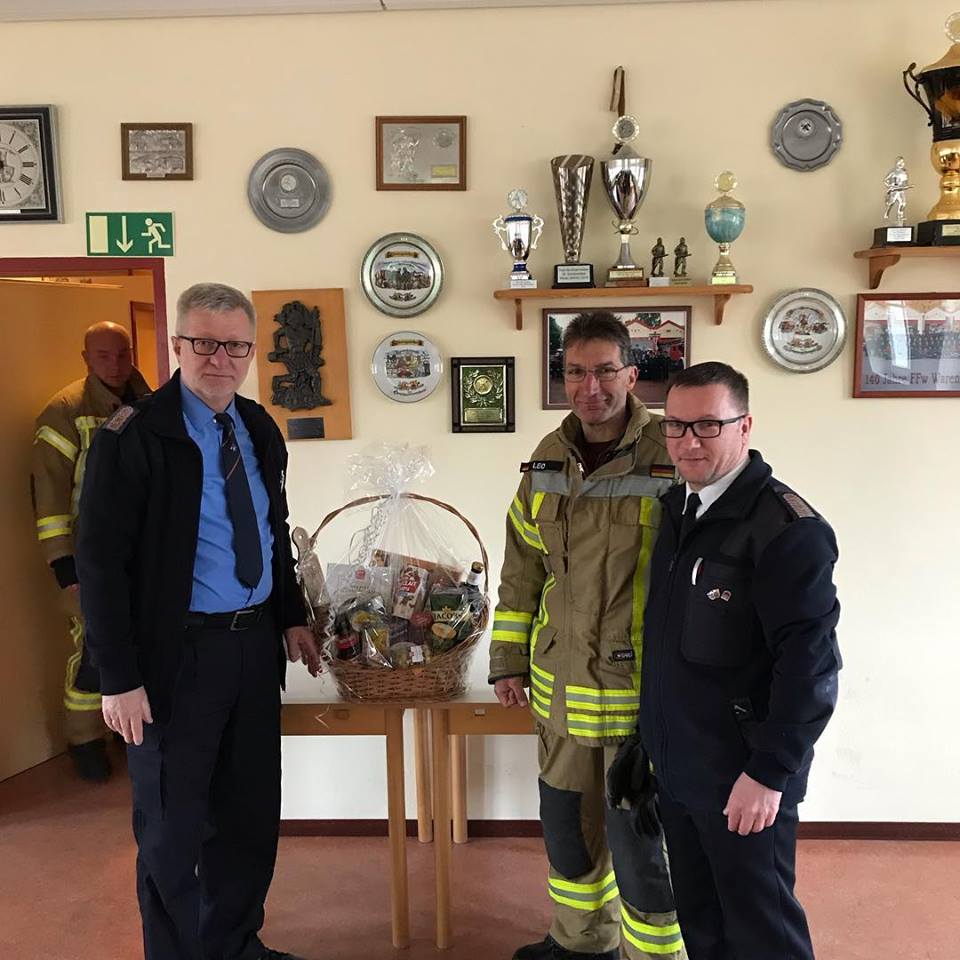 Überraschung gestern während der Ausbildung für den Warener Feuerwehrmann Jörg Kottke. Kreisbrandmeister Norbert Rieger kam mit einem großen Präsentkorb vorbei und bedankte sich bei Jörg für die hohe Einsatzbereitschaft.