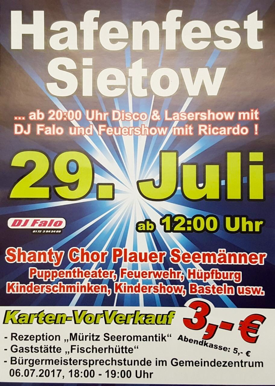 In Sietow laufen derzeit die Vorbereitungen für das große Hafenfest auf Hochtouren. Los geht’s am Sonnabend um 12 Uhr mit vielen Angeboten für große und kleinen Besucher, abends steigt dann eine Disco mit Laser- und Feuershow.