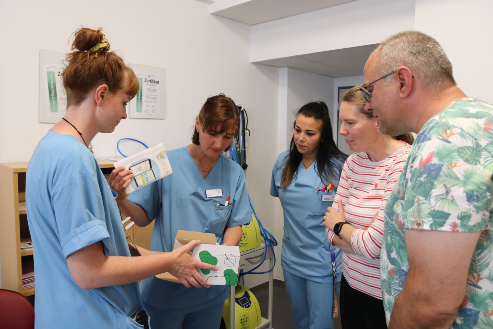 Bild: Julia Krüger (v.l.), Sabine Prösch und Judith Sarnow vom Brustkrebszentrum zeigen Sarah Schartow und Sebastian Hechler, was die