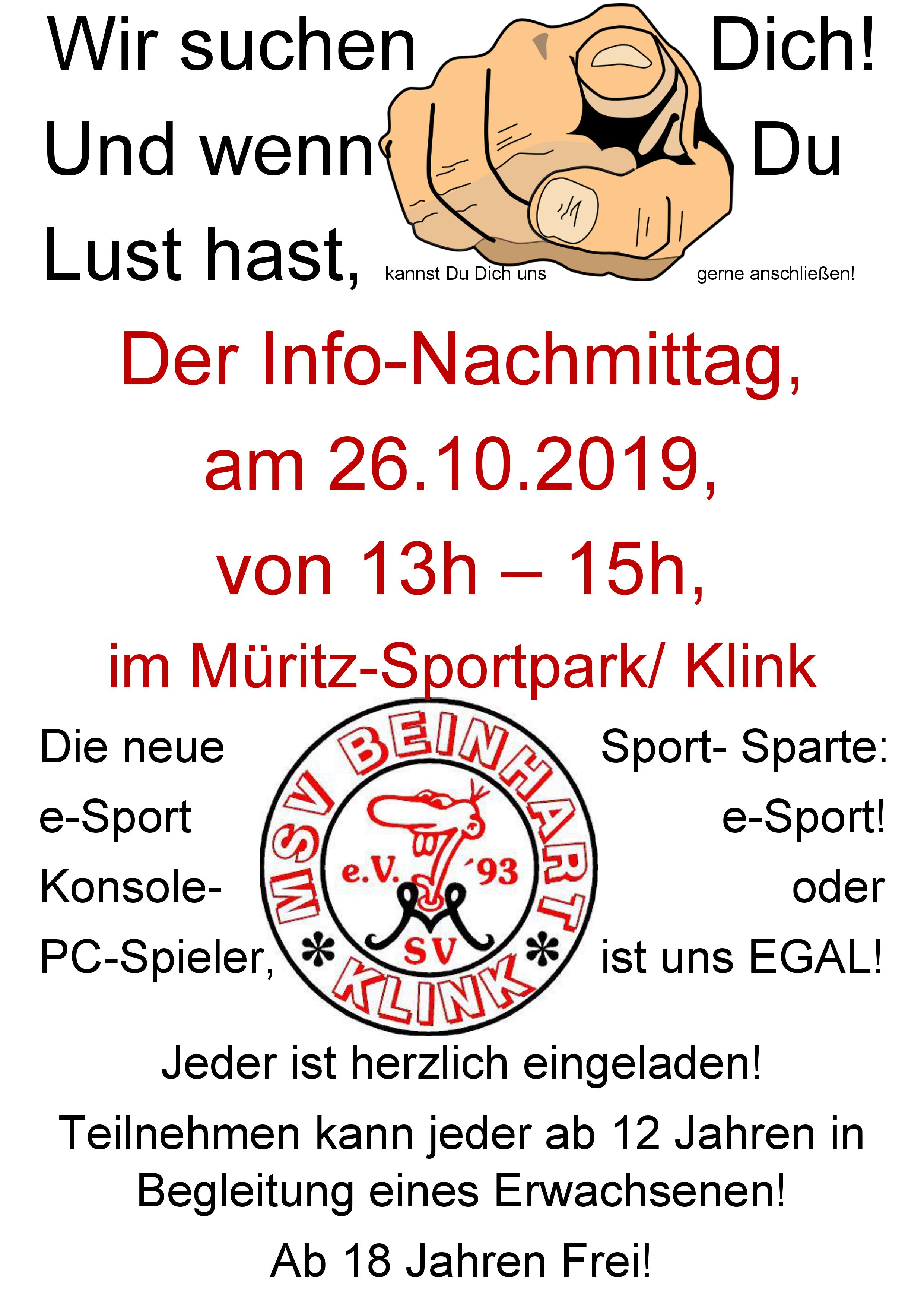 Der MSV-Beinhart Klink gründet eine neue Sparte, und jeder, der teilnehmen möchte, ist herzlich eingeladen, am morgigen Sonnabend, 26. Oktober, von 13-15 Uhr dabei zu sein. Teilnehmen kann jeder ab 12 Jahren in Begleitung eines Elternteils, ab 18 Jahren dann auch ohne.