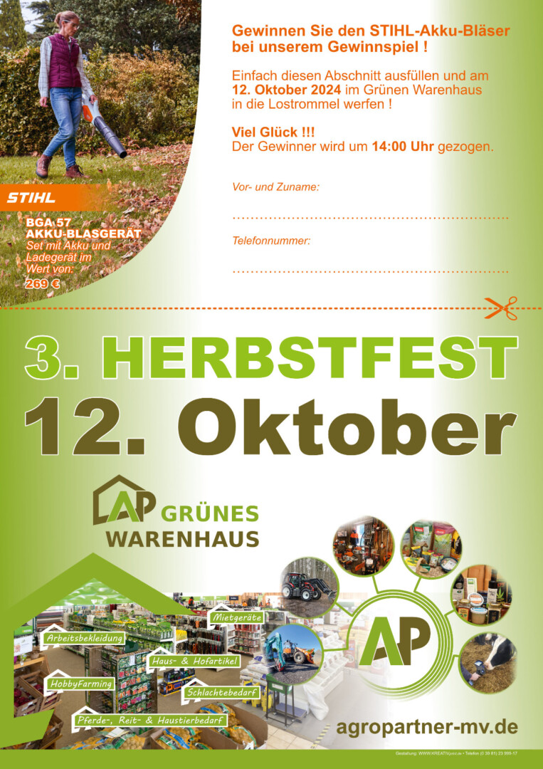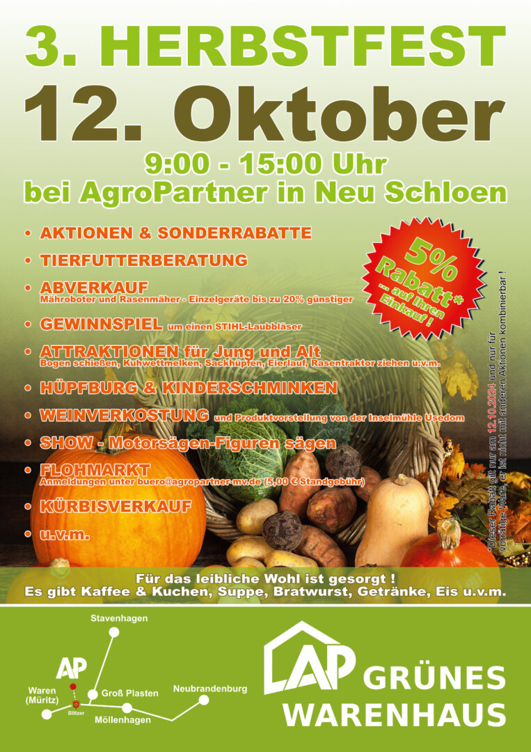 - Flohmarkt: Wer mit einem Stand teilnehmen möchte, kann sich direkt bei AgroPartner (buero@agropartner-mv.de oder Tel: 039934 – 898015 ) anmelden.