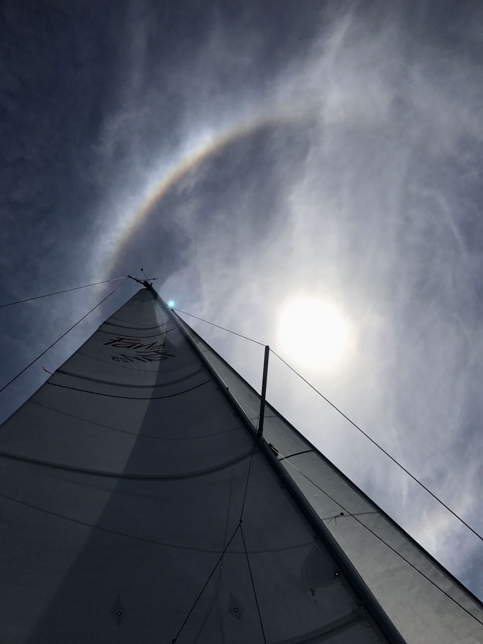 Diese Halo-Erscheinung gab es heute Mittag über der Müritz zu sehen. Halo-Erscheinungen sind farbige oder weiße Lichtkreise, -bögen und -flecken am Himmel, die durch Brechung und Spiegelung des Lichts an Eiskristallen entstehen.