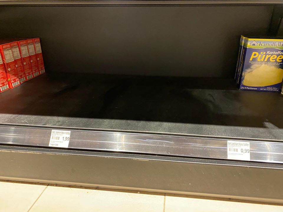 Wenn wir weiter so die Regale plündern wird das System irgendwann kollabieren. Will das Wer? Achja -den Egoisten scheint das egal zu sein. DENKT NACH.Miteinander und etwas solidarisch hilft allen Beteiligten. DANKE AN DIEJENIGEN -DIE JEDEN TAG DAS RAD AM LAUFEN LASSEN. IHR SEID DIE HELDEN DERZEIT!!!!!!
