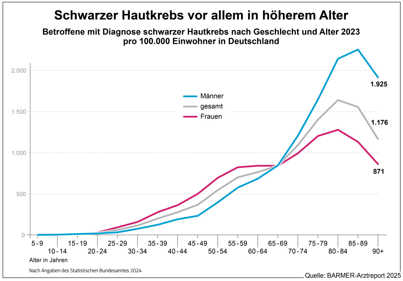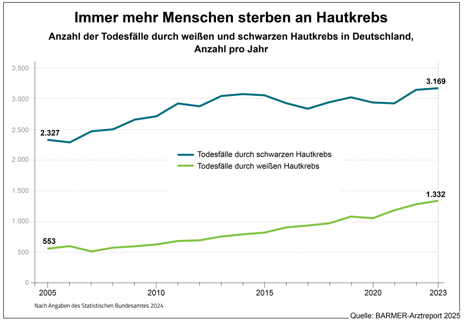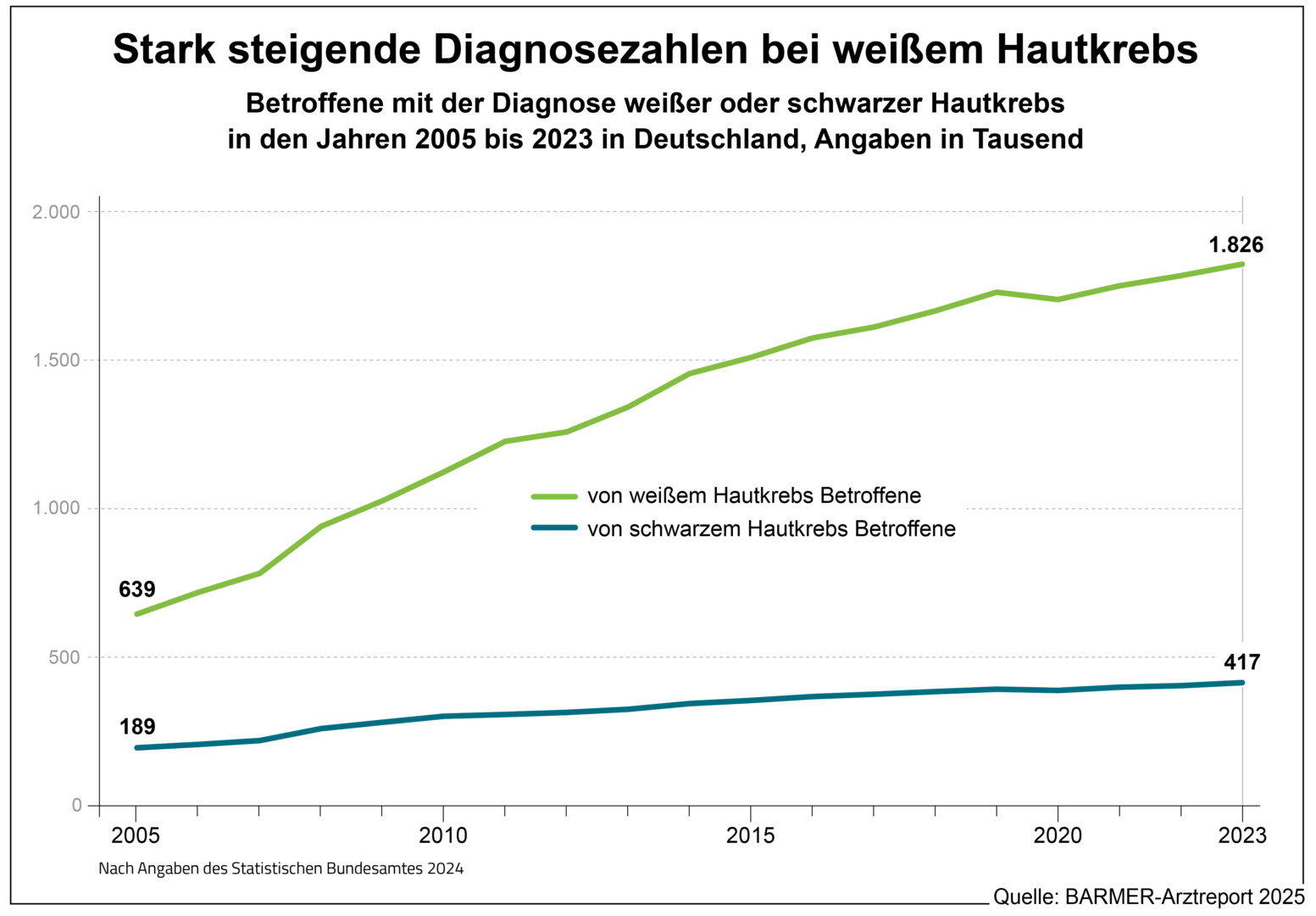 Die Anzahl der Menschen mit der Diagnose schwarzer Hautkrebs hat sich in Deutschland seit dem Jahr 2005 mehr als verdoppelt. Bei weißem Hautkrebs haben sich die Fallzahlen sogar nahezu verdreifacht. Diese Entwicklung droht, sich in den kommenden Jahren fortzusetzen. Das geht aus dem aktuellen Arztreport der Barmer hervor. Im Jahr 2023 erhielten demnach rund 417.400 Menschen die Diagnose malignes Melanom, umgangssprachlich schwarzer Hautkrebs genannt. Im Jahr 2005 waren es noch gut 188.600. Nicht-melanotischer Hautkrebs, auch bekannt als weißer Hautkrebs, wurde im Jahr 2023 bei rund 1,8 Millionen Menschen dokumentiert, im Jahr 2005 waren es etwa 630.000. Vor allem in den Geburtenjahrgängen ab Ende der 1950er-Jahre zeigen sich steigende Risiken. So lag zum Beispiel das Risiko für schwarzen Hautkrebs bei 1968 geborenen Frauen doppelt so hoch wie im Jahrgang 1952.