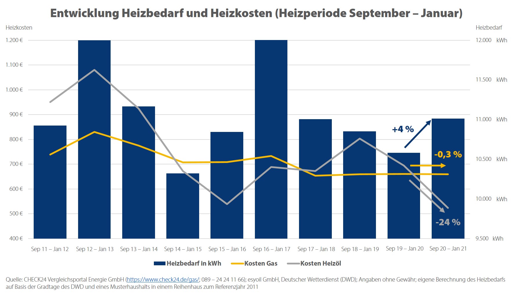 Eine Musterfamilie, die ihr Reihenhaus mit Gas heizt, zahlte dafür von September 2020 bis Januar 2021 insgesamt 659 Euro. Eine Familie mit Ölheizung zahlte in diesem Zeitraum 525 Euro. Mit Öl heizen Verbraucher in der aktuellen Heizperiode also knapp 20 Prozent günstiger als mit Gas.