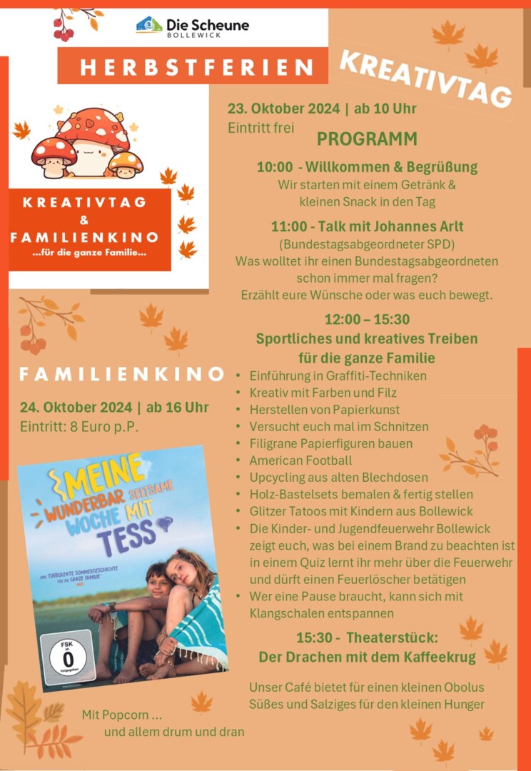 Die Herbstferien haben begonnen, und in der Scheune Bollewick stehen Veranstaltungen für die ganze Familie auf dem Programm. Und das ist geplant: