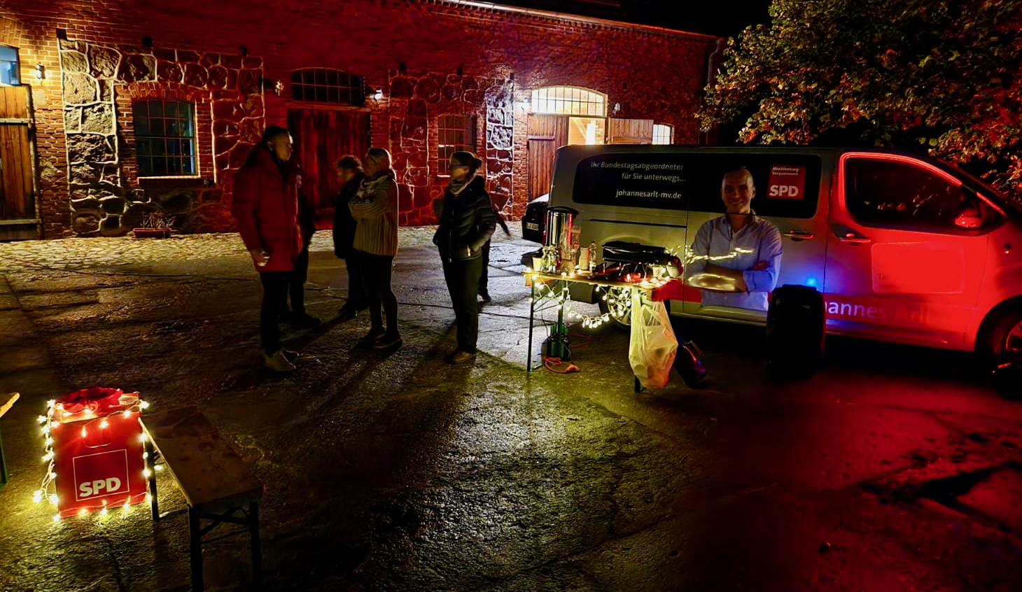 Es wird früh dunkel. Wer freut sich da nicht auf ein bisschen Herbststimmung und etwas Glühwein? Das mobile Büro des SPD-Bundestagsabgeordneten Johannes Arlt will „Herbstzauber“ und vorweihnachtliche Stimmung auch in das kleinste Dorf bringen. Und zwar am morgigen Mittwoch, 16. November, nach Groß Varchow. Natürlich darf dabei über Politik gesprochen werden, muss aber nicht“, sagt Johannes Arlt, der sich einfach aufs Klönen freut. Sein mobiles Büro wird von 16 bis 18 Uhr zum Glühweinstand. Auch Bratwurst ist im Angebot. Johannes Arlt ist direkt gewählter Abgeordneter für große Teile der Landkreise MSE im Deutschen Bundestag. Der Offizier vertritt den flächenmäßig größten Wahlkreis Deutschlands und ist Mitglied im Wirtschaftsausschuss, im Verteidigungsausschuss und als Stellvertreter im Verkehrsausschuss. Zusammen mit Nadine Julitz, MdL in für Stadt und Amt Waren, ist Johannes Arlt Vorsitzender des SPD-Kreisverbandes MSE.