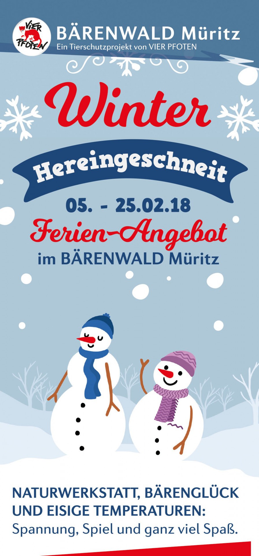In den Winterferien wartet im BÄRENWALD täglich ein abwechslungsreiches Ferienangebot auf die Mädchen und Jungen. Naturwerkstatt, Bärenglück und eisige Temperaturen: Spannung, Spiel und ganz viel Spaß. Kleine und große Bärenfans kommen bei verschiedensten Angeboten voll auf ihre Kosten.