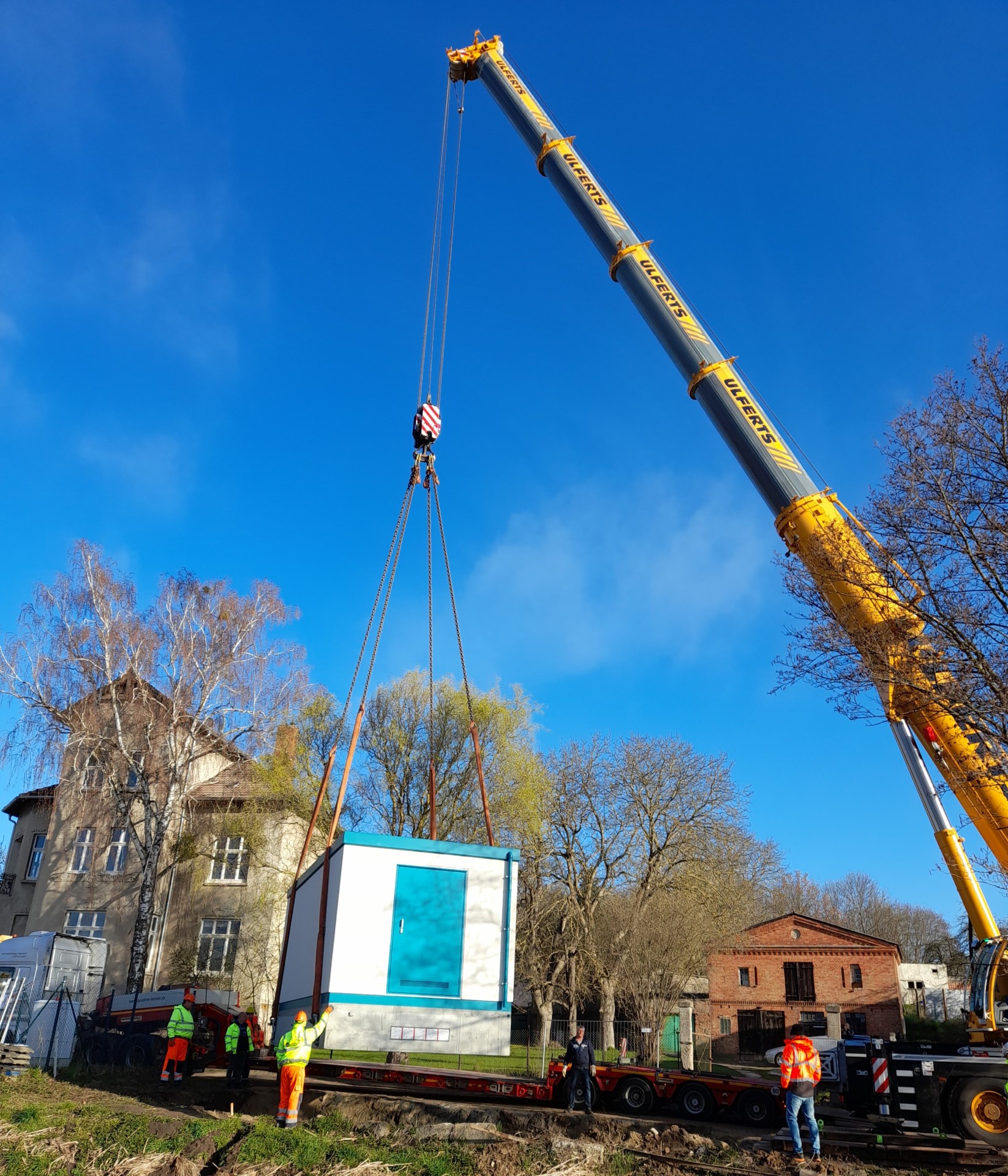 Mit Hilfe eines Schwerlastkrans wurde der 40 Tonnen schwere und 8 mal 3 Meter große Koloss zentimetergenau abgeladen und steht nun direkt in Penzlin in der Straße Am Mühlenbach. Damit das „Herz“ schlägt, wird der Knotenpunkt noch mit moderner Technik ausgerüstet. Im Inneren laufen einmal alle Glasfaserleitungen des gesamten Projektgebietes zusammen.