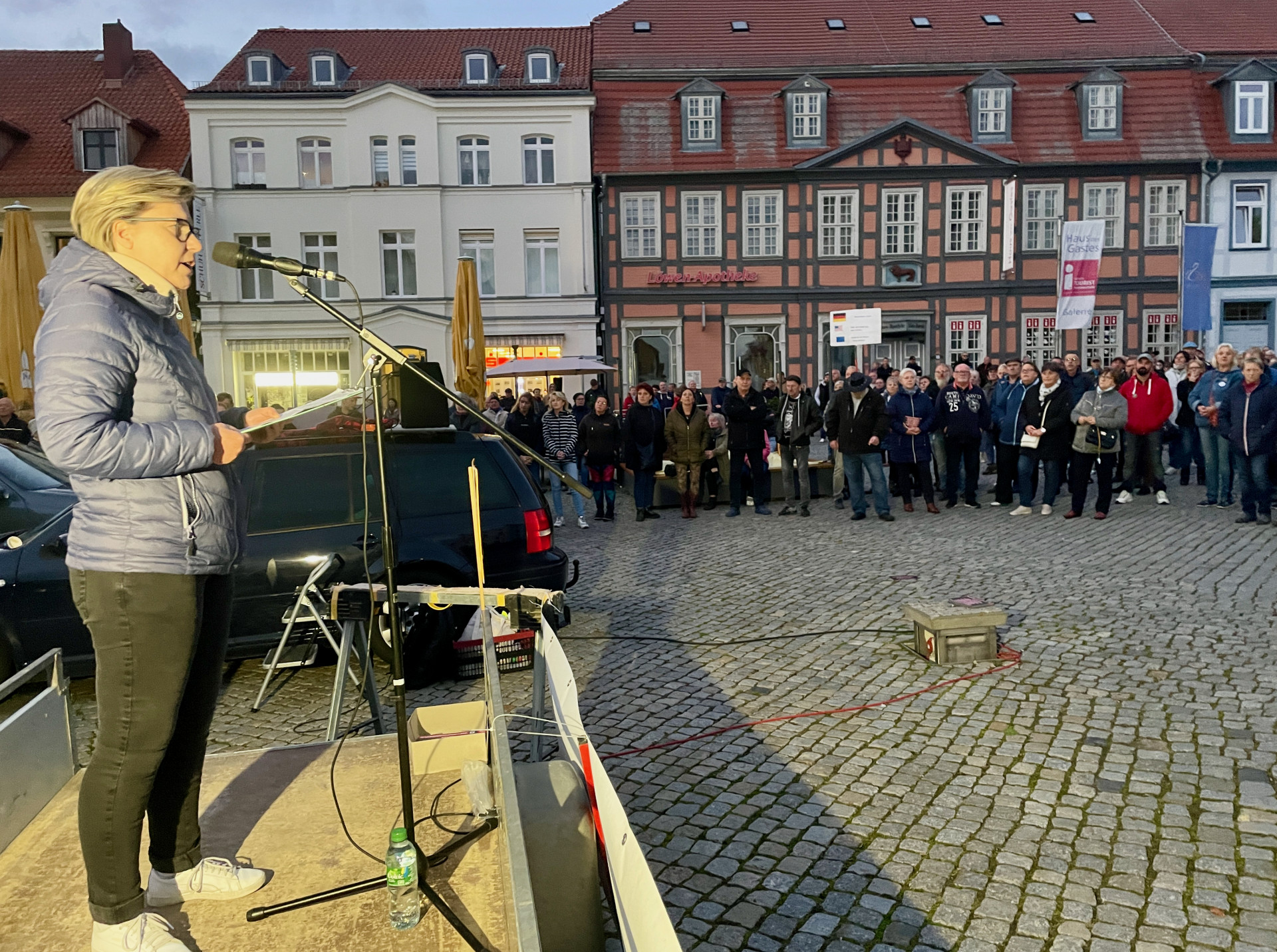 Lässt das Interesse nach oder sind es die Herbstferien? Mit rund 400 Frauen und Männern waren bei der heutigen Demo in Waren etwa nur halb so viele Teilnehmer dabei als vor einer Woche. Hauptrednerin heute: Katja Jedwillat, Inhaberin des Hotels „Goldene Kugel“. Sie machte einen Rundumschlag und sprach über verschiedene Themen der vergangenen Monate: Angefangen von der Corona-Politik, über Gendern und die Winnetou-Posse bis hin zur gebeutelten Autoindustrie und der aktuellen Energiekrise. Holger Anton als Sprecher Initiative „Müritzer Unternehmeraufstand“ informierte, dass am kommenden Mittwoch sowohl die Fraktionsvorsitzenden der Stadtvertretung als auch Bürgermeister Norbert Möller zu Gast bei der Initiative sind. Im Anschluss ging’s wieder mit Trommeln, Rasseln und Pfeifen durch die Stadt.