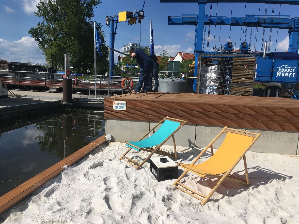 Im Hafendorf Müritz (Rechlin-Nord) gibt es seit Mai eine kleine Strandbar mit Liegestühlen und schneeweißem Sand (WSM berichtete über die Pirate’s Bar).Heute will die Kirchengemeinde noch einmal ab 11 Uhr einen Strandgottesdienst feiern. Die Pirate‘s Bar ist gleich neben dem Kran.