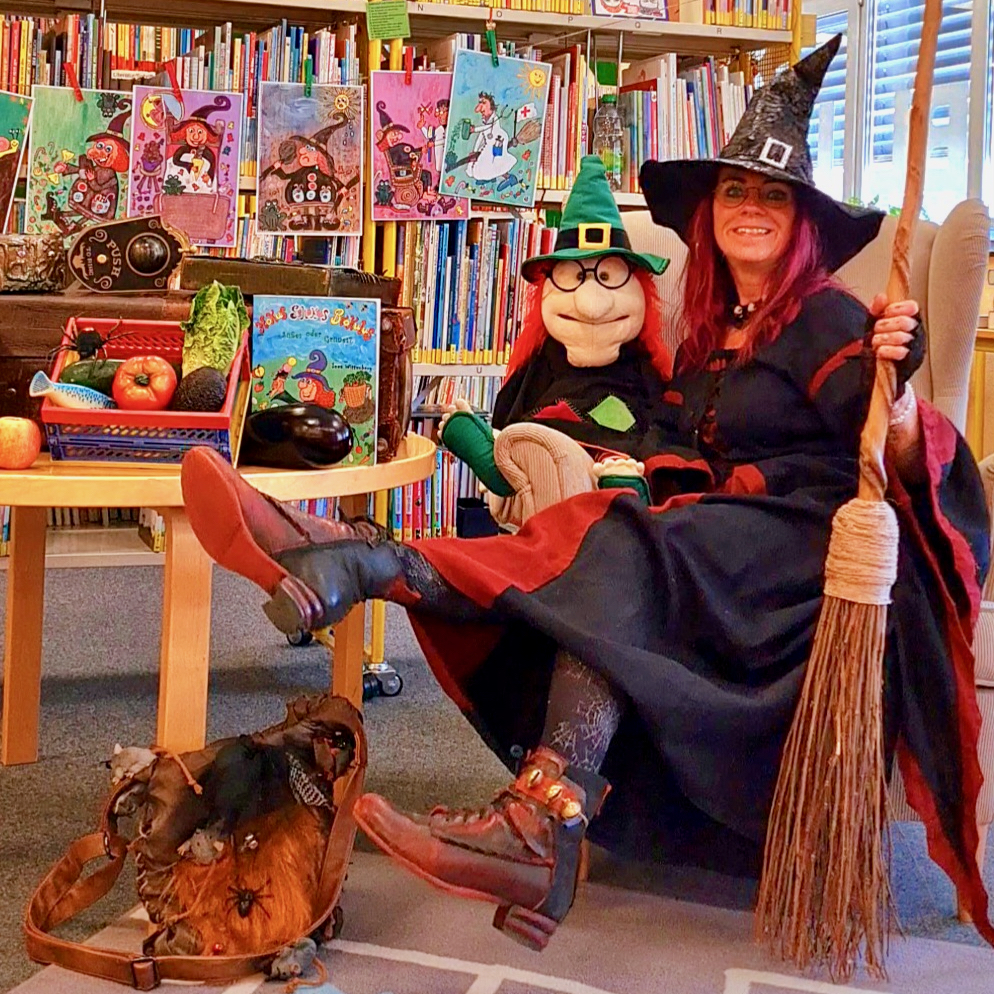 Die Mitarbeiterinnen der Stadtbibliothek, Ines Wittenberg und die Hexe Schnattayaga freuen sich auf viele Besucher.