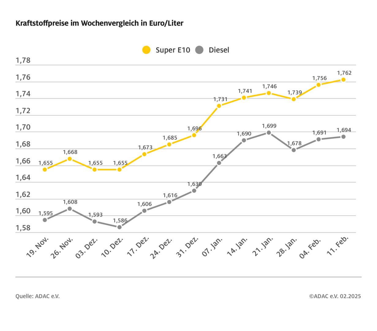 Ohne Weiteres nachvollziehbar ist aus Sicht des ADAC der aktuell hohe Stand des Benzinpreises allerdings nicht: Für ein Barrel Rohöl der Sorte Brent muss man zwar im Wochenvergleich mit 77 US-Dollar um etwa einen Dollar mehr zahlen als zuletzt. Der Euro-Dollar-Wechselkurs notiert aktuell unterhalb von 1,04 und liegt damit in etwa im Bereich der Vorwoche. Ein Blick auf den Benzinpreis vom 7. Januar 2025, also vor etwas mehr als einem Monat, zeigt jedoch einen mit dem heutigen Preis nahezu identischen Rohölpreis und auch Wechselkurs. Damals war Super E10 aber um über drei Cent je Liter günstiger als gegenwärtig.