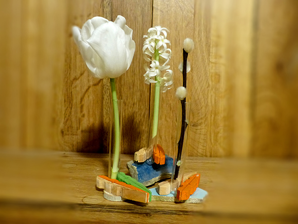Man nehme Fliesenbruchstücke, Holzscheiben, alte Holzwäscheklammern, Acrylfarbe, Kleber und Reagenzgläser. Und schwuppdiwupp entsteht eine individuelle Vase. Upcycling für Anfänger. Die Materialien werden kostenfrei zur Verfügung gestellt, für den Spaß am Rumbasteln sind die Gäste zuständig. Dazu werden eine Raffaelo-Torte sowie warme oder kalte Getränke serviert.