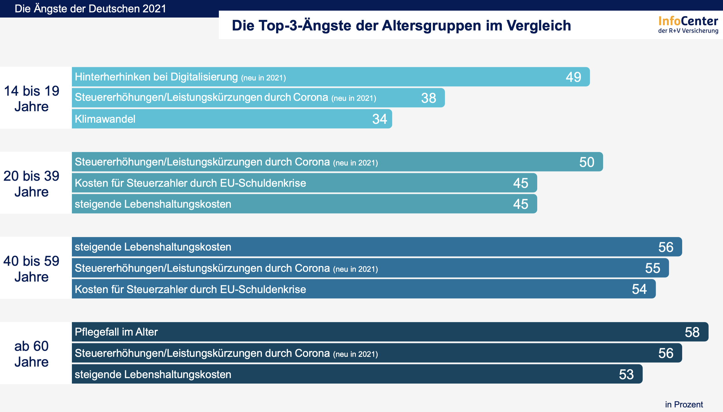 „Der Schuldenberg, der sich bei Bund, Ländern und Kommunen zur Bewältigung der CoronaPandemie aufgetürmt hat, bereitet den Deutschen in diesem Jahr die größten Sorgen“, sagt Brigitte Römstedt, Leiterin des R+V-Infocenters. 53 Prozent der Deutschen haben Angst davor, dass der Staat wegen der Schuldenlast aus der Corona-Krise dauerhaft Steuern erhöht oder Leistungen kürzt – Platz eins der diesjährigen Umfrage. Die Sorge um die persönlichen Finanzen spiegeln auch die Plätze zwei und drei der Umfrage wider: Jeder zweite Deutsche befürchtet, dass die Lebenshaltungskosten steigen (Vorjahr: 51 Prozent) und dass die Steuerzahler für die EU-Schuldenkrise zur Kasse gebeten werden (Vorjahr: 49 Prozent). „Die Top-Ängste zeugen vom Realismus der Befragten – und vom Vorrang ihrer materiellen Interessen“, kommentiert Prof. Dr. Manfred G. Schmidt, Politikwissenschaftler an der Ruprecht-Karls-Universität in Heidelberg. Er berät das R+V-Infocenter seit fast zwei Jahrzehnten bei der Auswertung der Ängste-Studie.