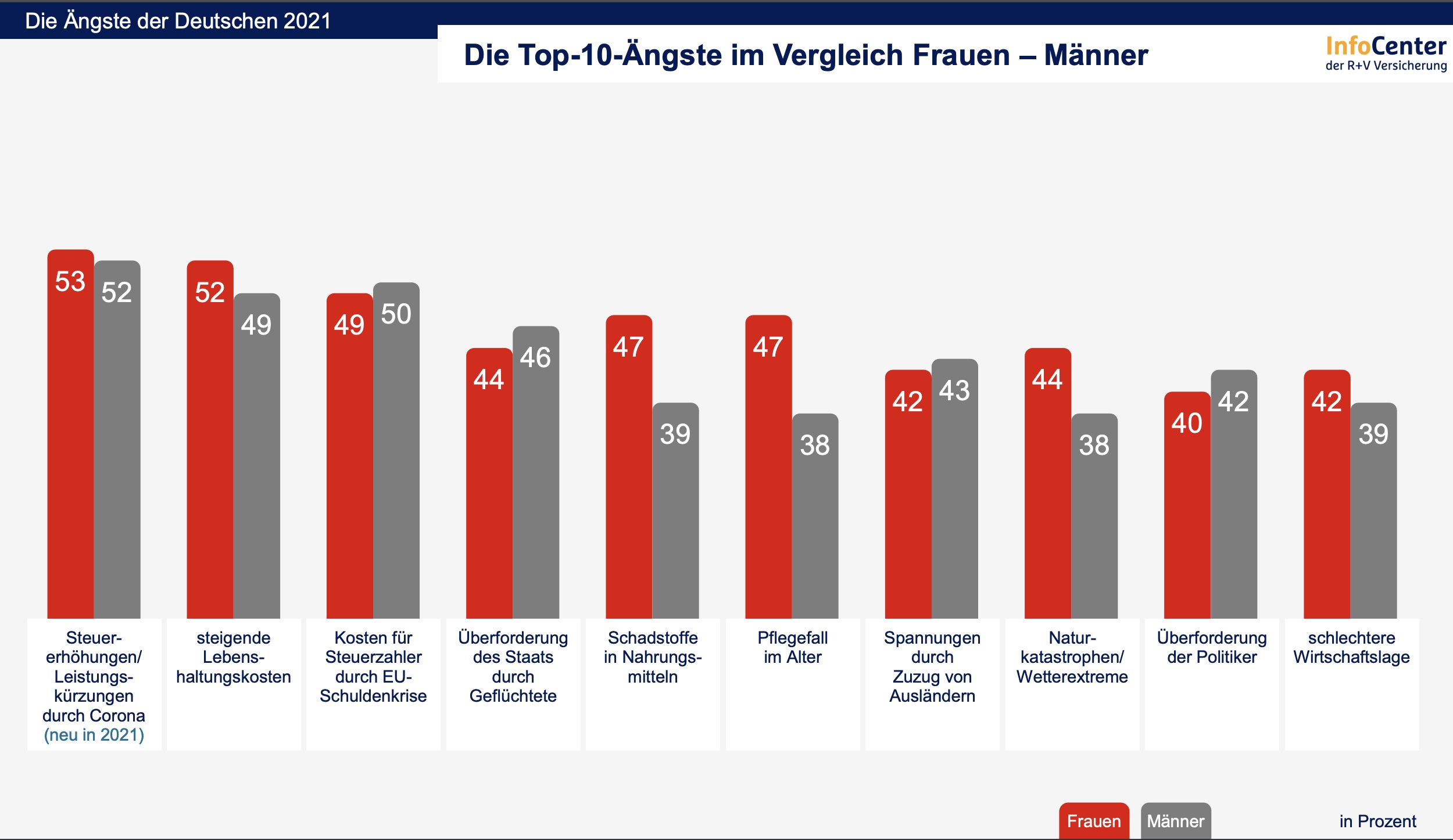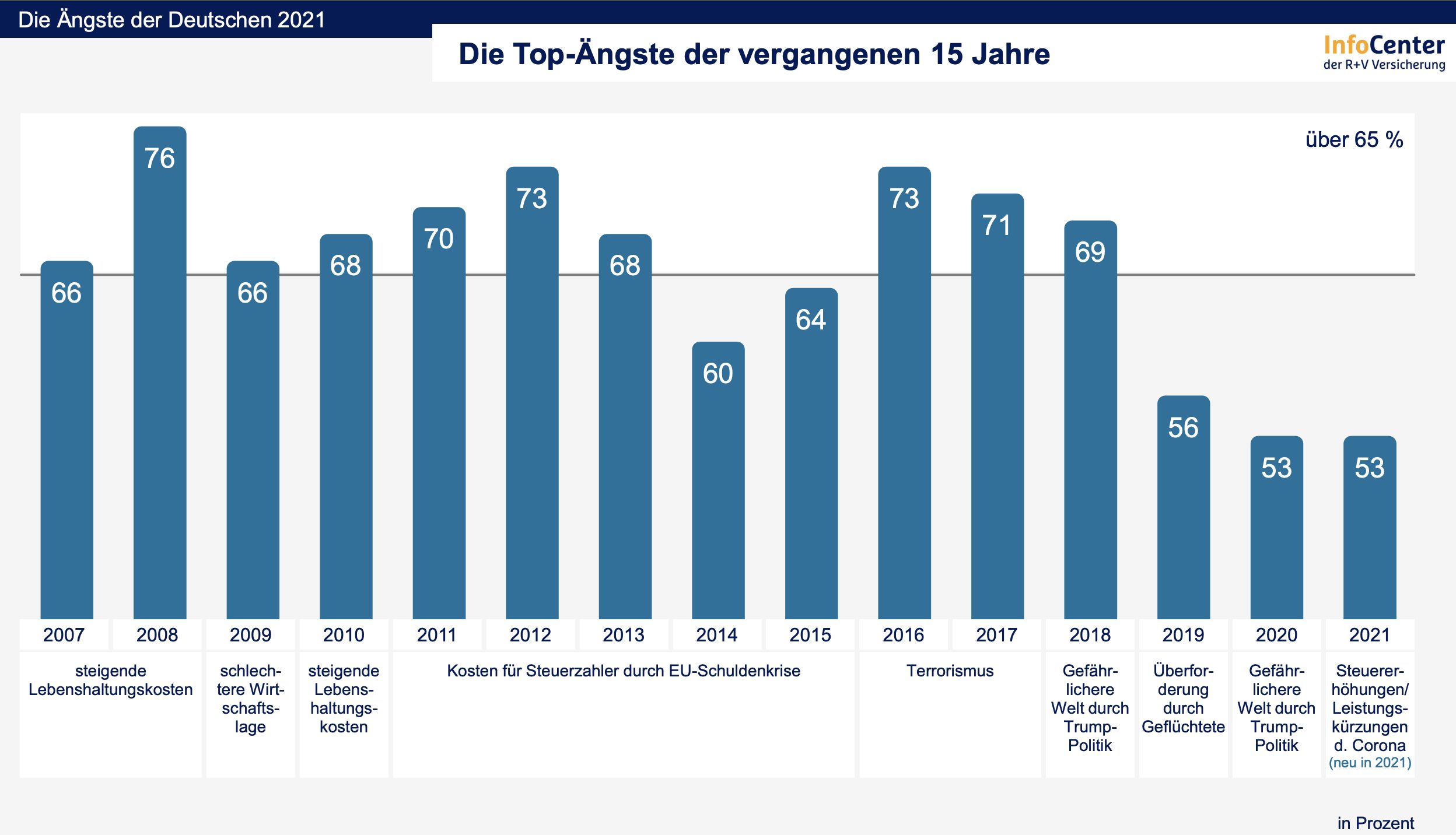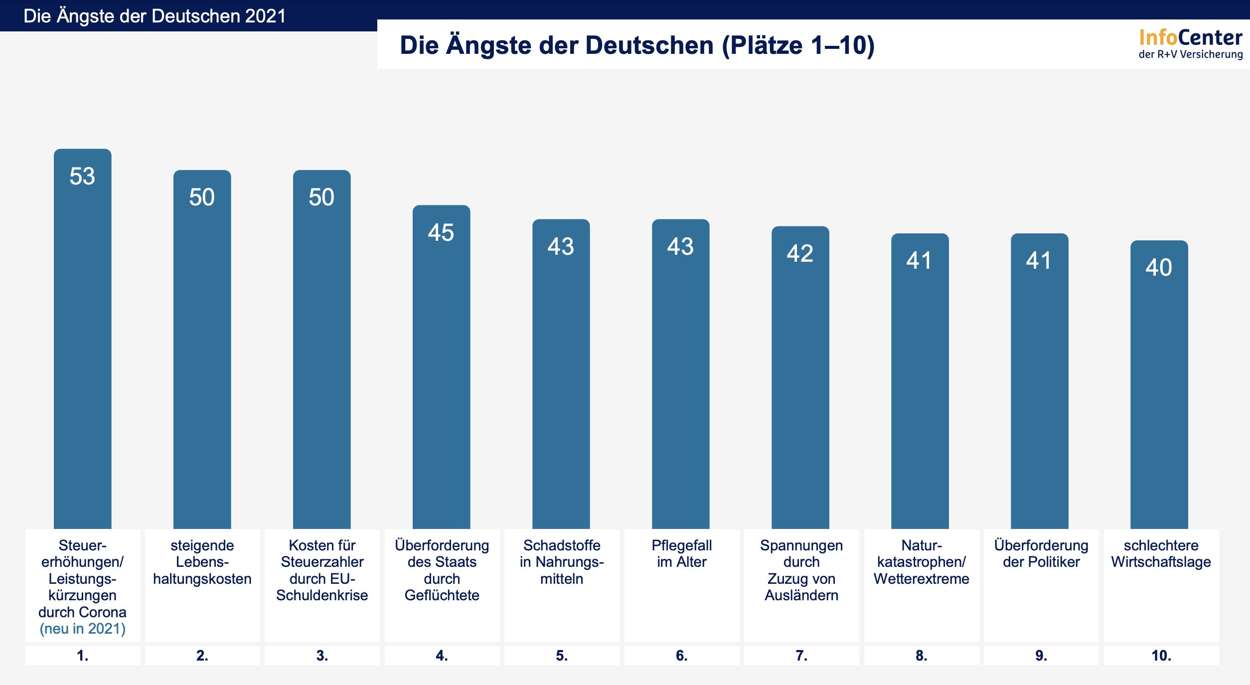 „Der Schuldenberg, der sich bei Bund, Ländern und Kommunen zur Bewältigung der CoronaPandemie aufgetürmt hat, bereitet den Deutschen in diesem Jahr die größten Sorgen“, sagt Brigitte Römstedt, Leiterin des R+V-Infocenters. 53 Prozent der Deutschen haben Angst davor, dass der Staat wegen der Schuldenlast aus der Corona-Krise dauerhaft Steuern erhöht oder Leistungen kürzt – Platz eins der diesjährigen Umfrage. Die Sorge um die persönlichen Finanzen spiegeln auch die Plätze zwei und drei der Umfrage wider: Jeder zweite Deutsche befürchtet, dass die Lebenshaltungskosten steigen (Vorjahr: 51 Prozent) und dass die Steuerzahler für die EU-Schuldenkrise zur Kasse gebeten werden (Vorjahr: 49 Prozent). „Die Top-Ängste zeugen vom Realismus der Befragten – und vom Vorrang ihrer materiellen Interessen“, kommentiert Prof. Dr. Manfred G. Schmidt, Politikwissenschaftler an der Ruprecht-Karls-Universität in Heidelberg. Er berät das R+V-Infocenter seit fast zwei Jahrzehnten bei der Auswertung der Ängste-Studie.