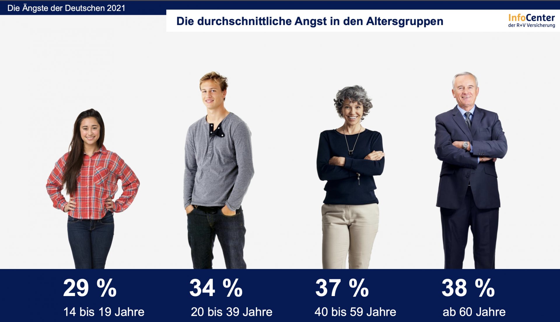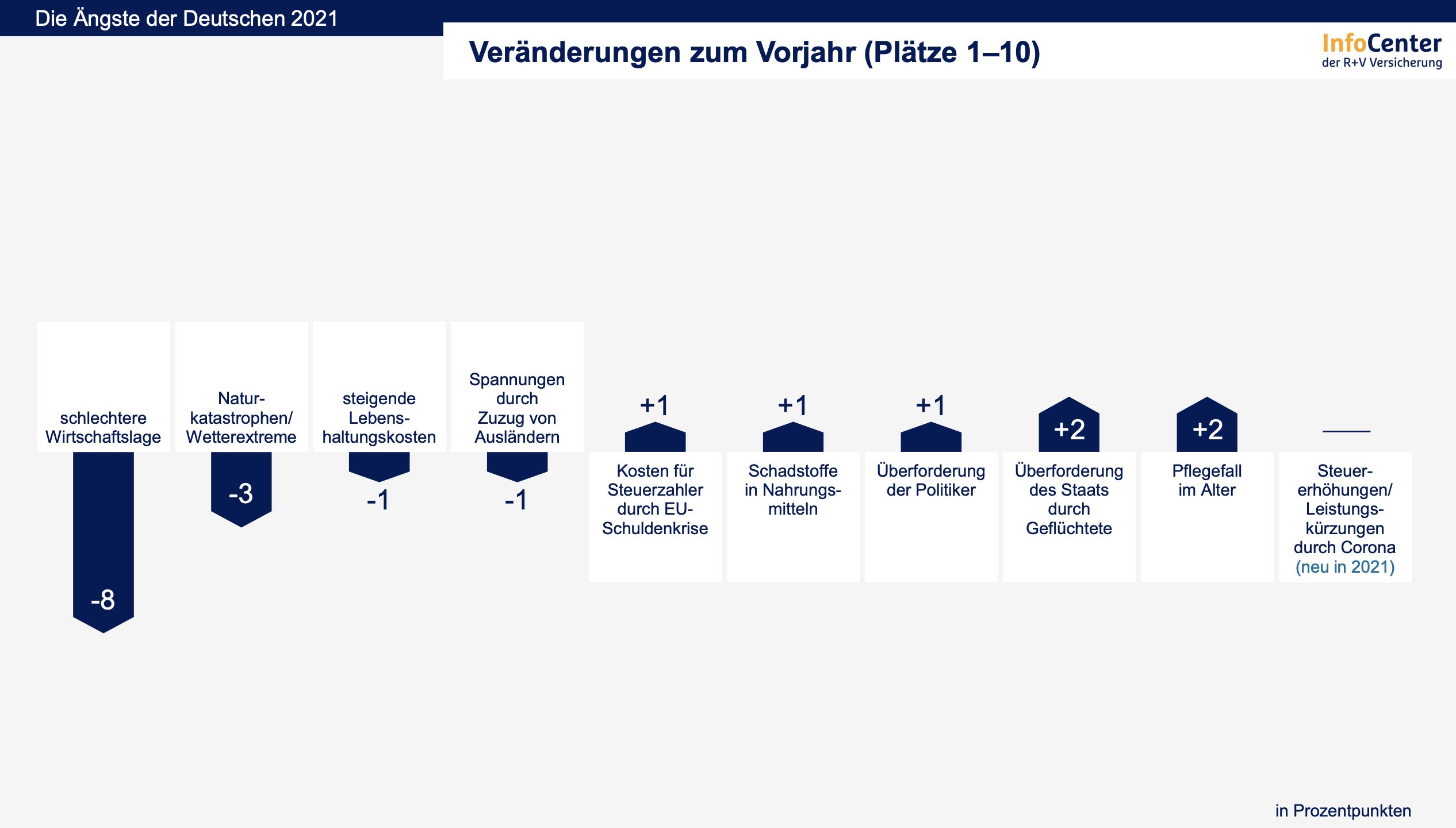 Die Sorge um die Wirtschaftslage in Deutschland ist jedoch geringer geworden. Sie liegt mit 40 Prozent auf Platz zehn des Rankings. Im vergangenen Jahr – als das Geschäftsleben während der Pandemie erlahmte – lag sie mit 48 Prozent auf Platz vier der Umfrage. „Offensichtlich sind die Befragten erleichtert, dass die Wirtschaft nach dem stärksten Einbruch in der Geschichte der Bundesrepublik Deutschland wieder in Schwung kommt“, erläutert Schmidt. Mit dem Konjunkturaufschwung sinkt auch die Angst vor Arbeitslosigkeit: Nur knapp ein Drittel der Befragten (31 Prozent; Vorjahr: 40 Prozent) befürchtet steigende Arbeitslosenzahlen. Noch geringer ist die Angst vor dem Verlust des eigenen Jobs (24 Prozent; Vorjahr: 25 Prozent).