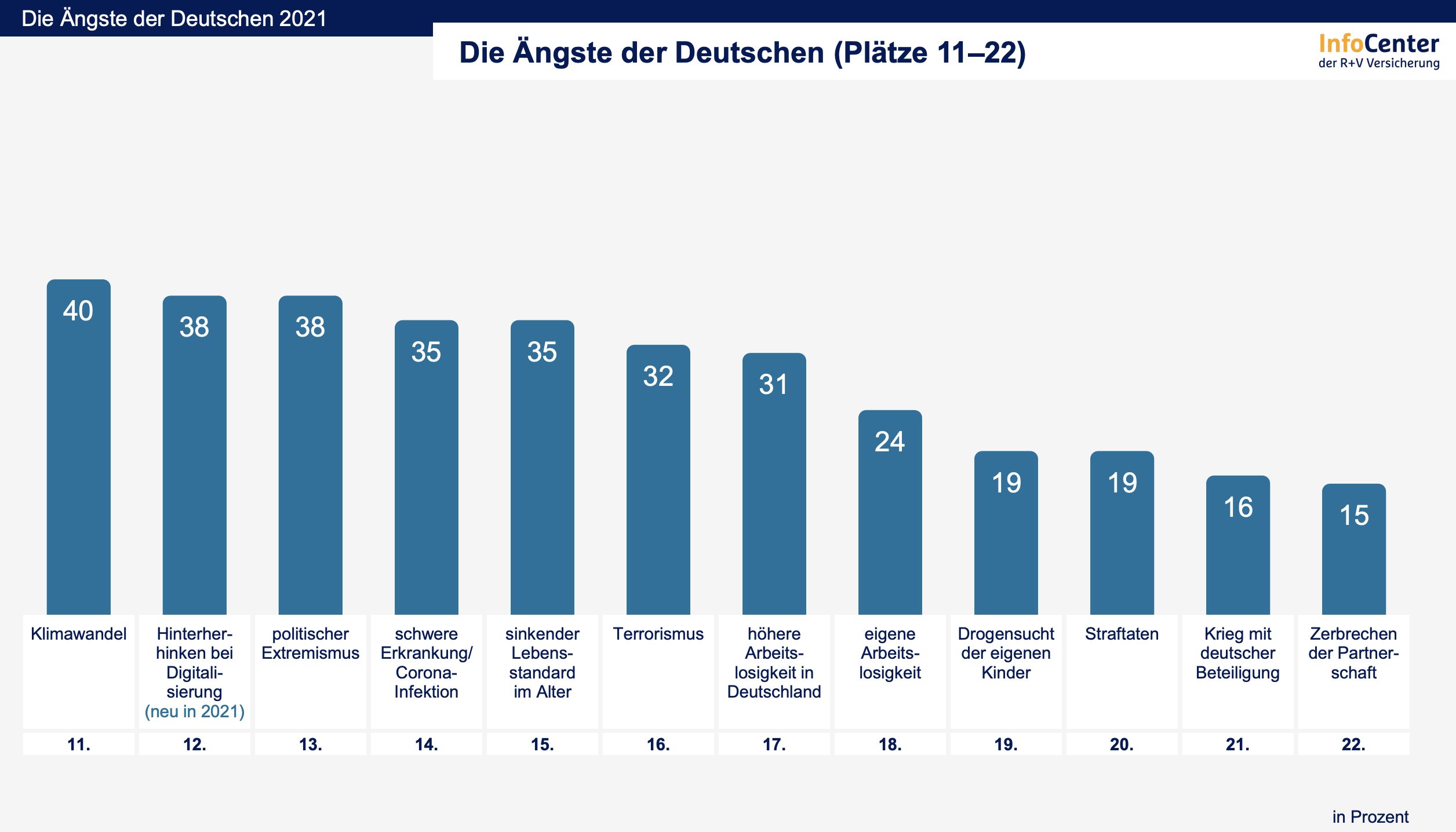 • Partnerschaft (Platz 22 und wie immer Schlusslicht): Schadet die erzwungene Nähe in der Corona-Zeit der Beziehung? Die Angst vor dem Zerbrechen der Partnerschaft steigt auf 15 Prozent. Im vergangenen Jahr lag sie mit zehn Prozent noch auf Rekordtief.