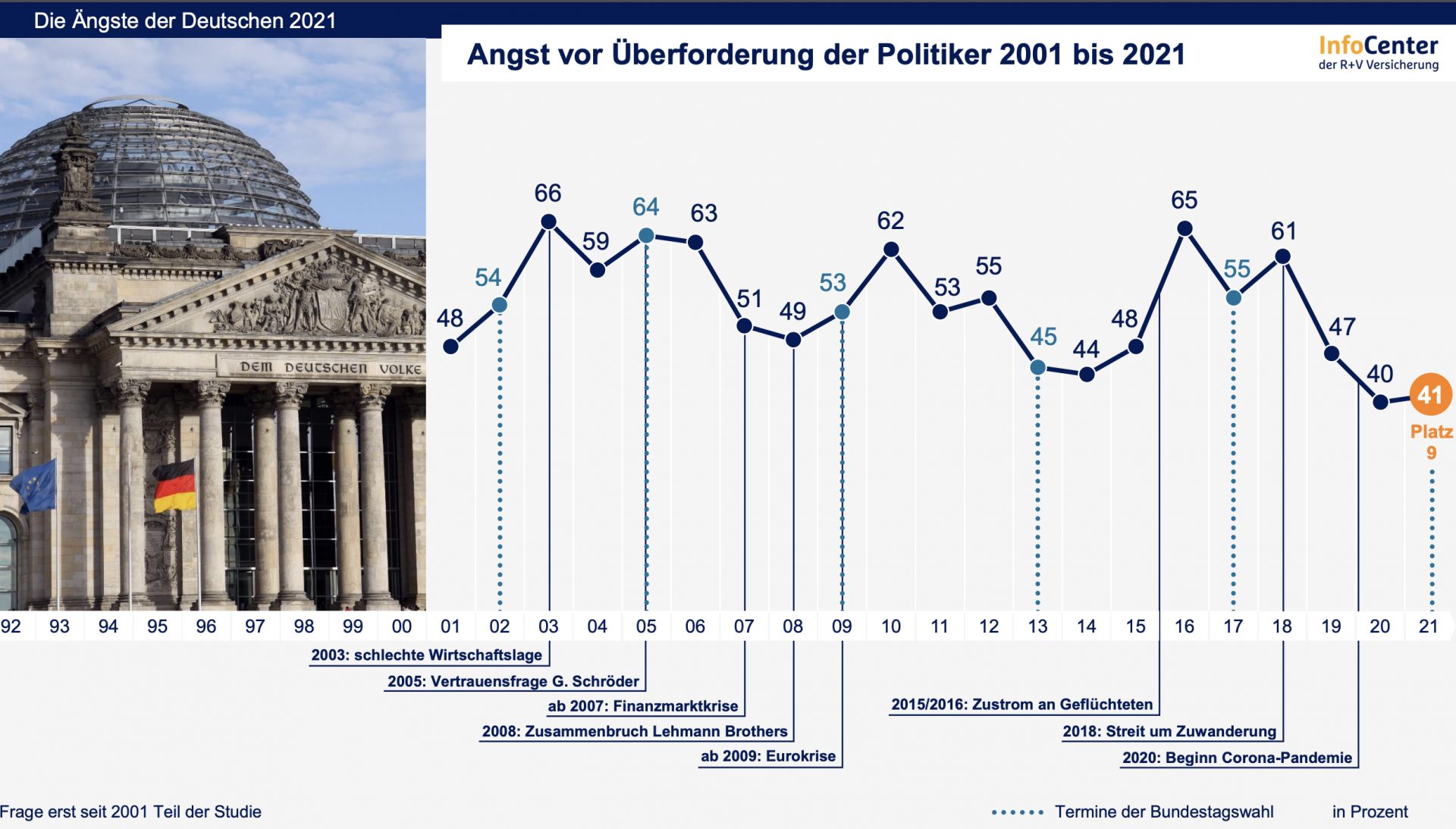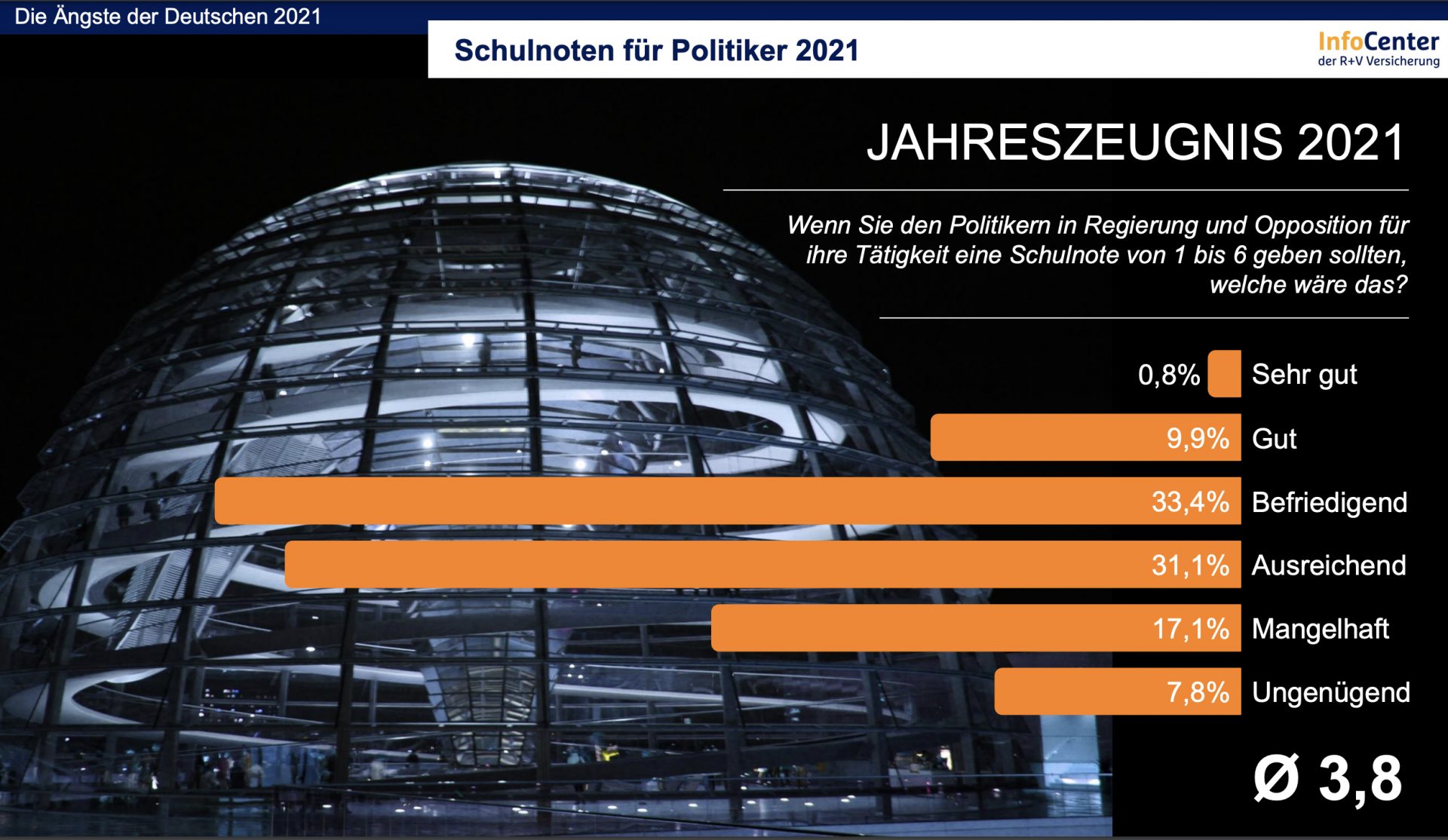 Im Wahljahr 2021 befürchten 41 Prozent der Deutschen, dass die Politiker von ihren Aufgaben überfordert sind. Für ein Wahljahr dennoch ein moderater Wert. Zum Vergleich: Bei der Wahl vor vier Jahren zweifelten 55 Prozent der Befragten daran, dass die Politiker ihren Aufgaben gewachsen sind. Im Osten hadern die Bürger mehr mit den Politikern als im Westen (Ost: 50 Prozent, West: 39 Prozent). Traditionell trauen die Deutschen den Politikern wenig zu. Das spiegelt sich auch in den Schulnoten wider, die die Befragten den Politikern für ihre Leistungen vergeben. Demnach erhalten sie im Jahreszeugnis im Schnitt eine 3,8. Auffällig: die Noten „mangelhaft“ und „ungenügend“ finden sich mit fast 25 Prozent mehr als doppelt so oft im Politiker-Zeugnis wie „sehr gut“ oder „gut“.