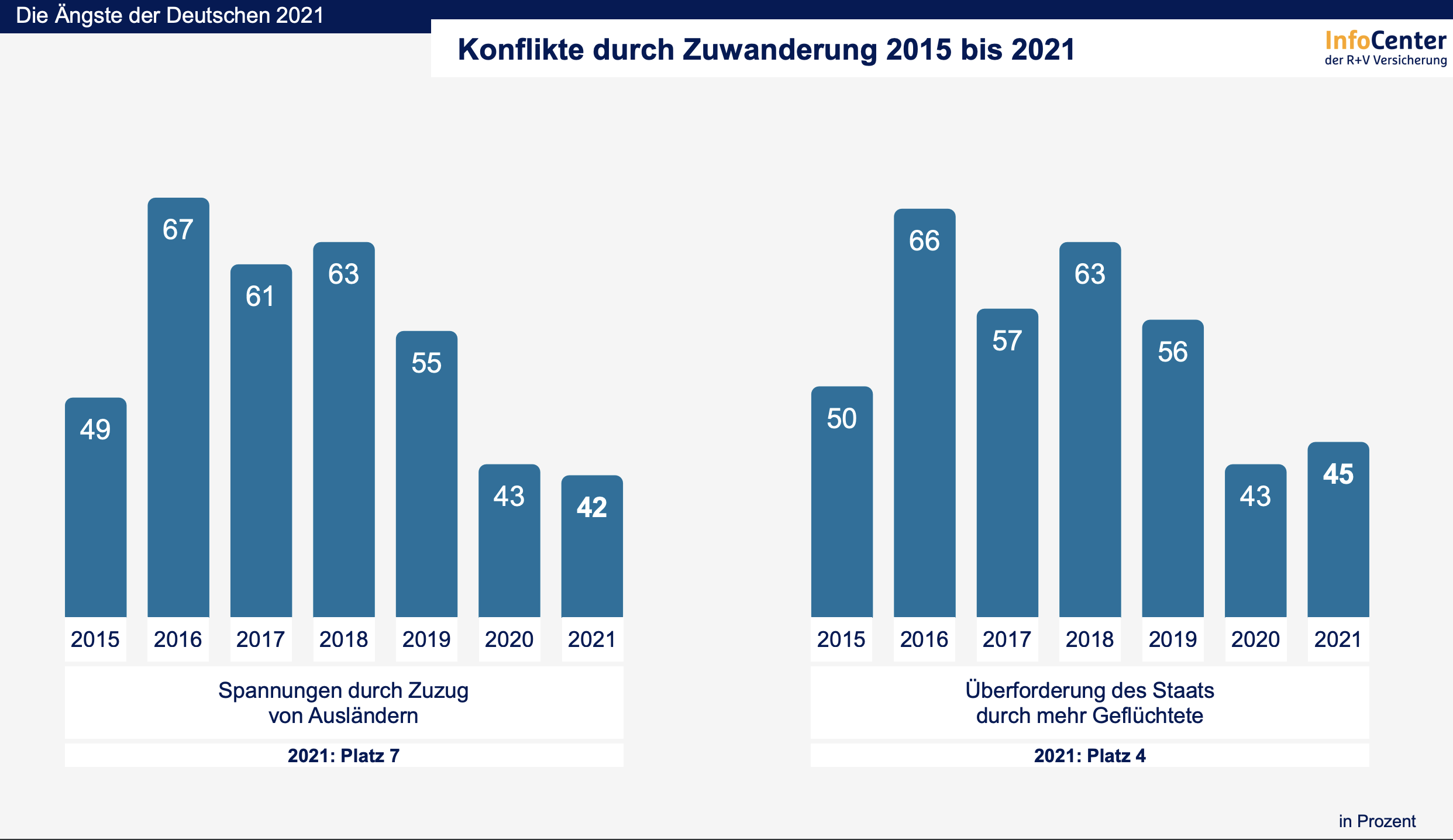 Zu den größten Ängsten der Deutschen zählen nach wie vor die Zuwanderungsthemen. 45 Prozent der Befragten befürchten, dass die große Zahl der Geflüchteten die Deutschen und ihre Behörden überfordert (Platz vier; Vorjahr: 43 Prozent, Platz sieben). Auch die Sorge vor Konflikten durch weitere Zuwanderung bleibt präsent (42 Prozent; Vorjahr: 43 Prozent).