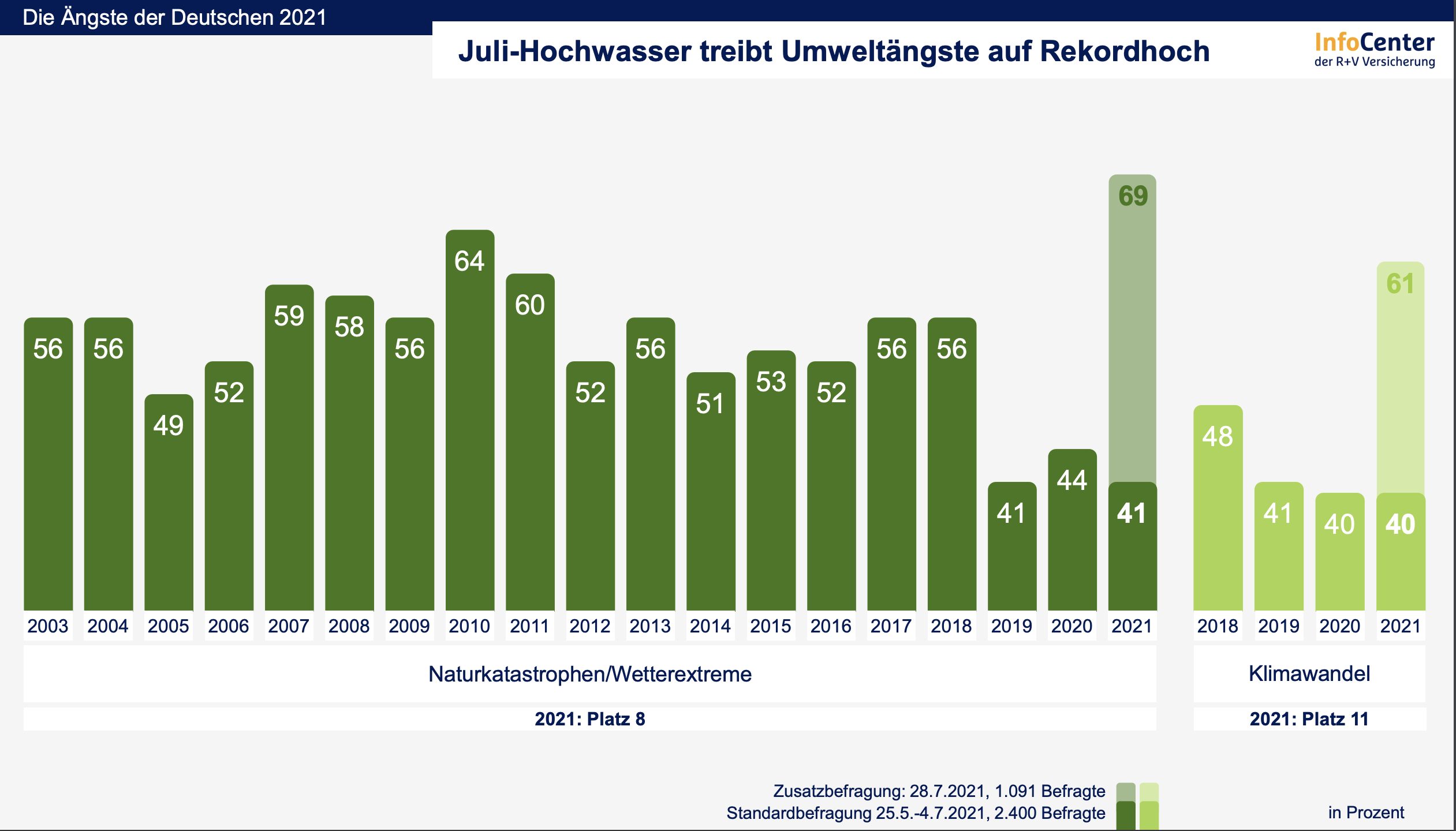 In der regulären Umfrage bleiben die Umweltsorgen etwa auf dem Niveau des Vorjahres: 41 Prozent der Befragten haben große Angst vor häufigeren Naturkatastrophen und Wetterextremen (Platz 8; Vorjahr: 44 Prozent, Platz 5). Vor den Auswirkungen des Klimawandels fürchten sich wie im vergangenen Jahr 40 Prozent der Deutschen. „Die Unwetter im Juni haben die Ängste nicht geschürt, obwohl schon zu dieser Zeit Starkregen, Sturm und Hagel in vielen Teilen Deutschlands schwere Schäden anrichteten“, sagt Römstedt. Das ändert sich jedoch nach der verheerenden Hochwasserkatastrophe in Nordrhein-Westfalen und Rheinland-Pfalz. „Da die Ängste-Umfrage zu dieser Zeit bereits abgeschlossen war, haben wir Ende Juli in einer Online-Umfrage weitere 1.000 Bürger nach ihren Umweltängsten befragt“, erklärt Römstedt.
