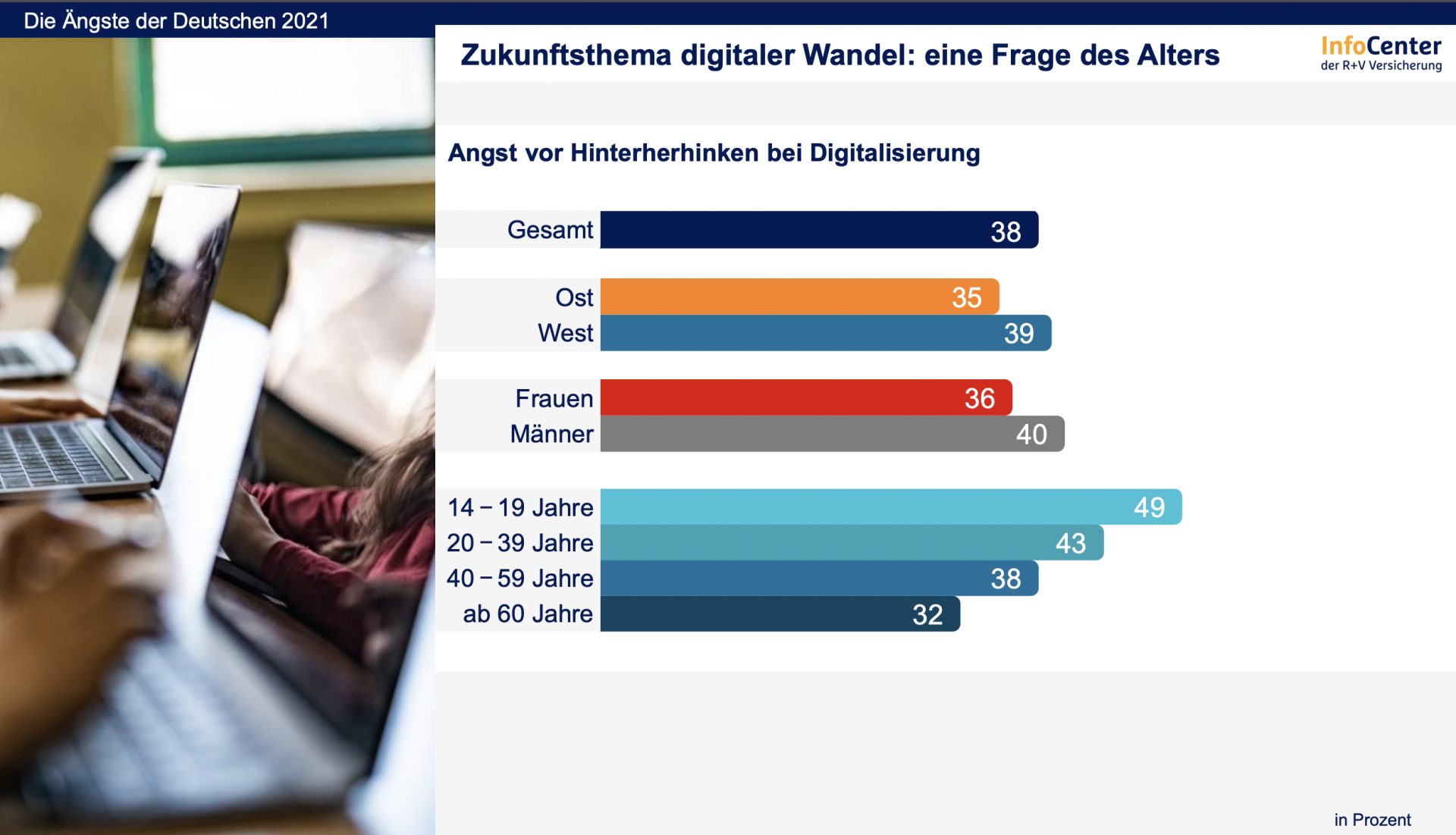 Doch es gibt erhebliche Unterschiede bei den Altersgruppen: Während von den 14- bis 19-Jährigen noch jeder Zweite (49 Prozent) besorgt ist, dass die Digitalisierung nicht massiv genug vorangetrieben wird, sinkt diese Angst bei den 20- bis 39-Jährigen auf 43 Prozent. Ab 60 Jahren sorgt das Thema weniger als jeden Dritten.