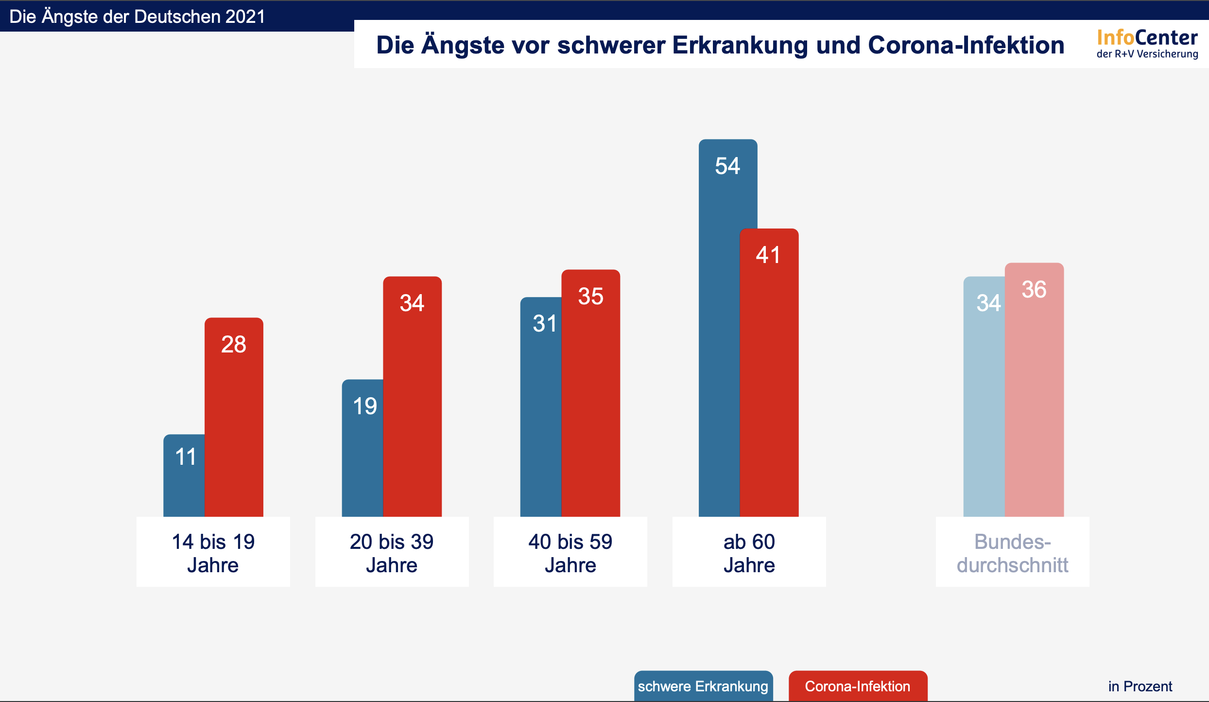 • Schwere Erkrankung/Corona-Infektion (Platz 14): Gering bleibt in der von Corona dominierten Zeit die Angst vor einer schweren Erkrankung (35 Prozent; Vorjahr: 32 Prozent). Ebenfalls nur etwa jeder Dritte fürchtet sich davor, dass er sich selbst oder die Menschen in seinem Umfeld mit dem Corona-Virus infizieren könnte.