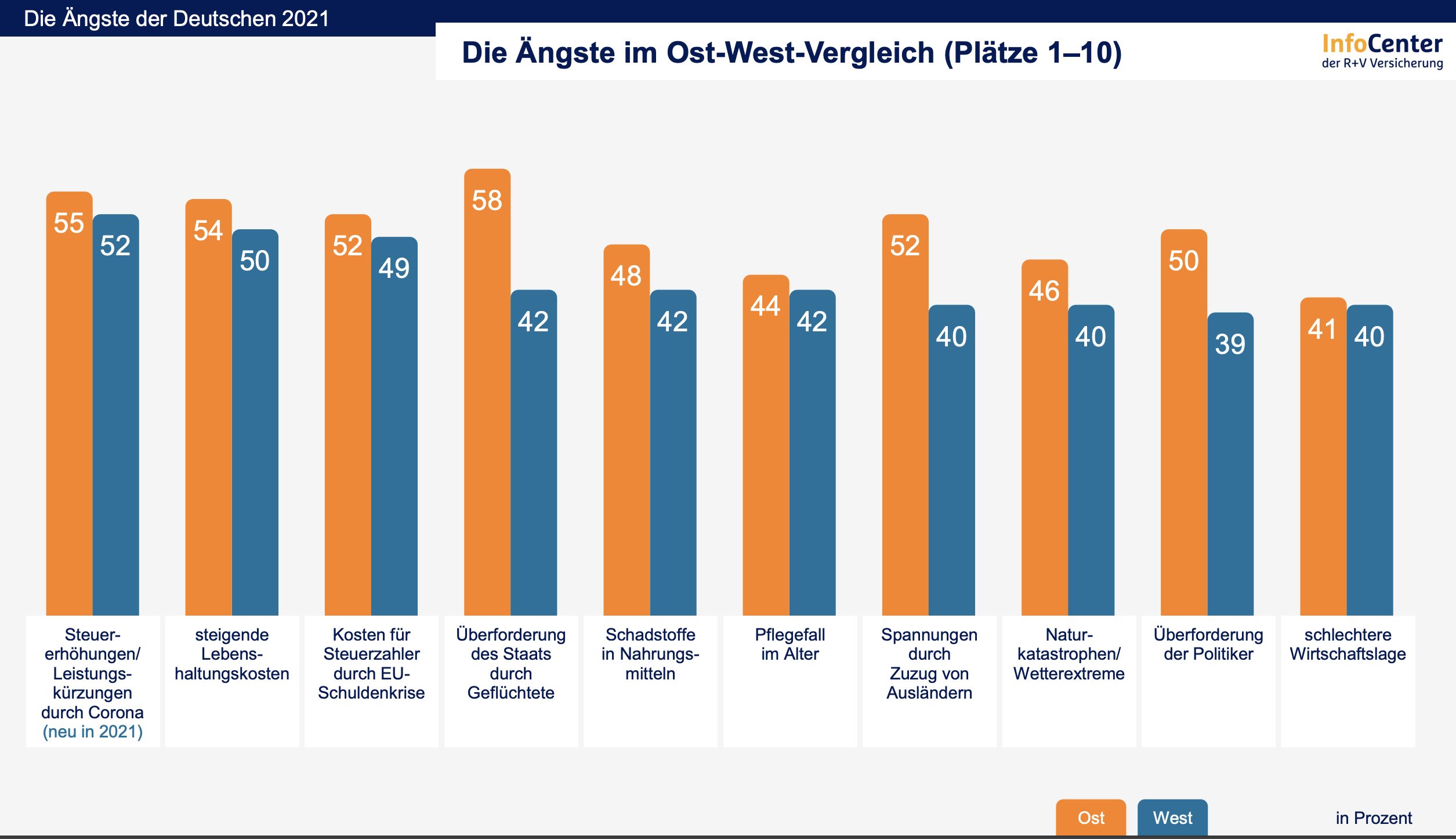 • Angst-Index: Insgesamt sind die Deutschen 2021 gelassen. Der Durchschnitt aller abgefragten Ängste bleibt mit 36 Prozent (Vorjahr: 37 Prozent) auf ähnlich niedrigem Niveau wie im Vorjahr. Im Osten ist die durchschnittliche Angst allerdings mit 40 Prozent um fünf Prozentpunkte höher als im Westen.