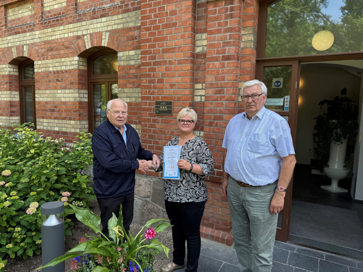 Sie haben es wieder mit Bravour gemeistert, die Mitarbeiter des Hotels Am Tiefwarensee: Bei der Klassifizierung des DEHOGA holten sie wieder deutlich mehr Punkte als für ihre drei Sterne Superior, die das Haus seit Jahren schmücken, nötig gewesen wären. Das Hotel, das vom Lebenshilfswerk betrieben wird, erreichte 425 Punkte, 410 sind Bedingung für diese Klassifizierung. Klar, dass alle im Team richtig stolz waren, als Mitglieder des DEHOGA die erneute Zertifizierung an Hotelleiterin Cathleen Lasarzik überreichten.