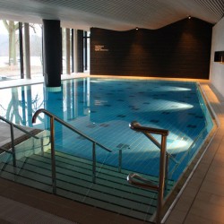 Zum Wellnessbereich gehören neben dem Schwimmbad vier verschiedene Saunen, ein so genanntes japanisches Onsen-Becken, von dem aus man einen tollen Blick auf den Tiefwarensee hat, ein großzügiger Fitnessraum sowie verschiedene Räume für Massage und Beauty.