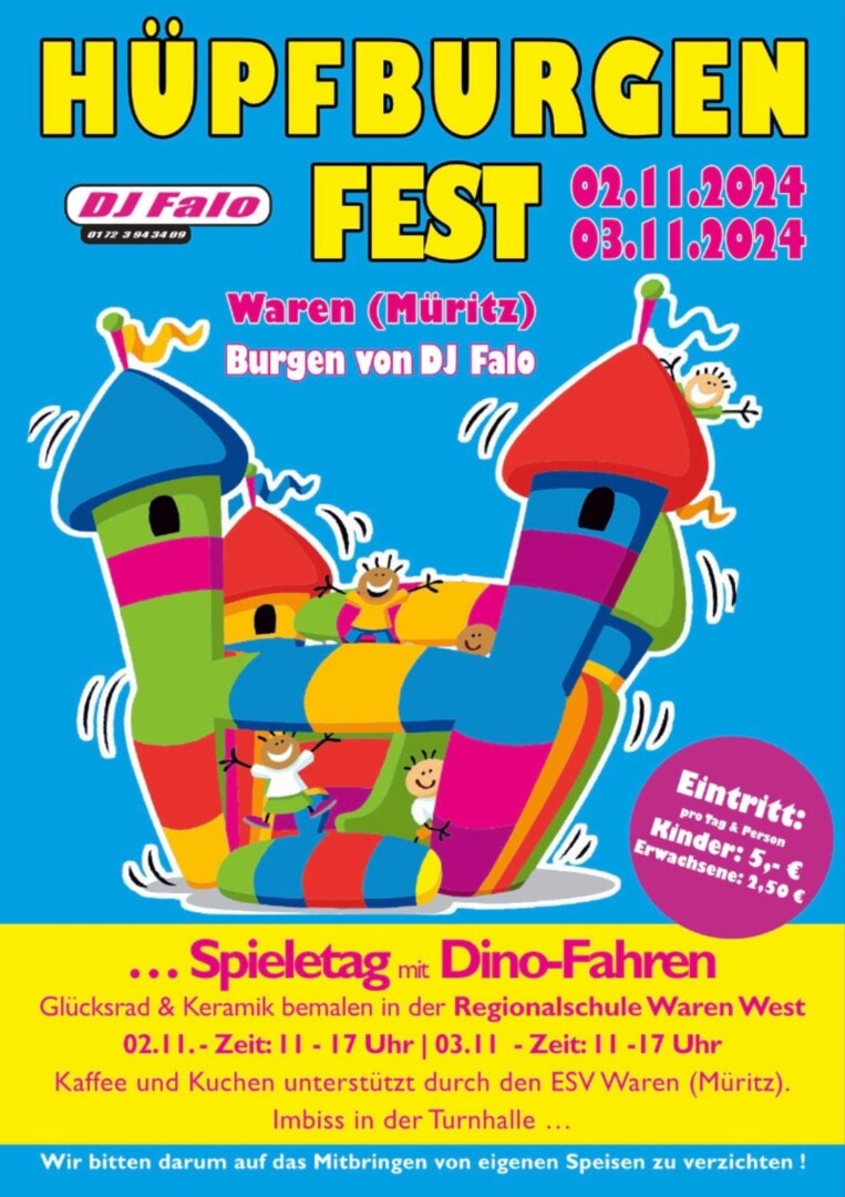 Für den kommenden Sonnabend und Sonntag, 2. und 3. November, hat DJ Falo in der Turnhalle der Regionalen Schule Waren wieder ein großes Hüpfburgenfest organisiert. So können sich die Kinder an diesen beiden Tagen von 11 bis 17 Uhr so richtig austoben – entweder in einer der vielen originellen Hüpfburgen oder auch auf den niedlichen Dino-Fahrzeugen. Außerdem dürfen die Kleinen am Glücksrad drehen und Keramik bemalen. Für Kaffee und Kuchen sorgen Mitglieder des ESV Waren, der Eintritt kostet 5 Euro für Kinder und 2,50 Euro für begleitende Erwachsene.