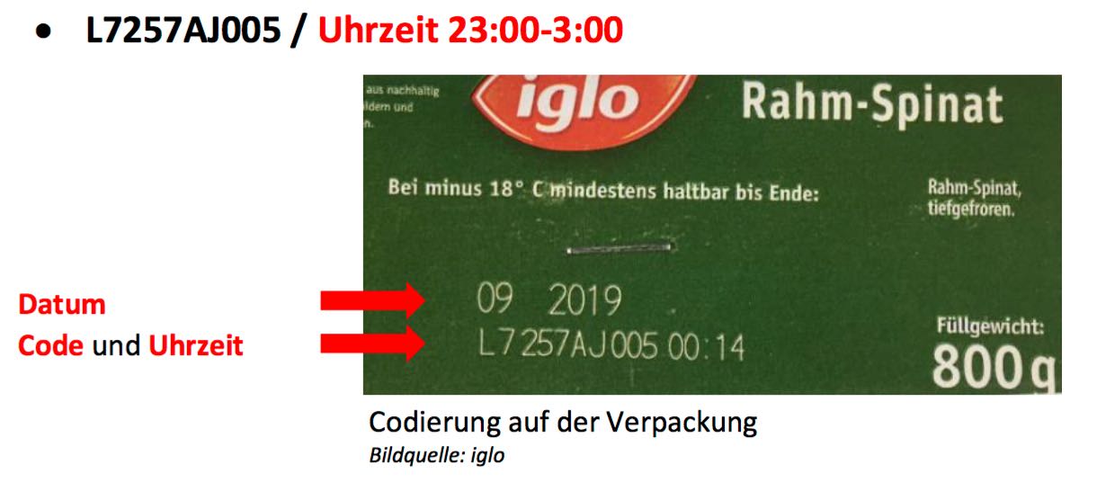 Grund für den vorsorglichen Rückruf der Charge „800g-Packung – iglo Rahm-Spinat“ ist, dass kleine schwarze Plastikteile von ca. 8 mm Länge und ca. 4 mm Breite vorkommen könnten. Diese könnten