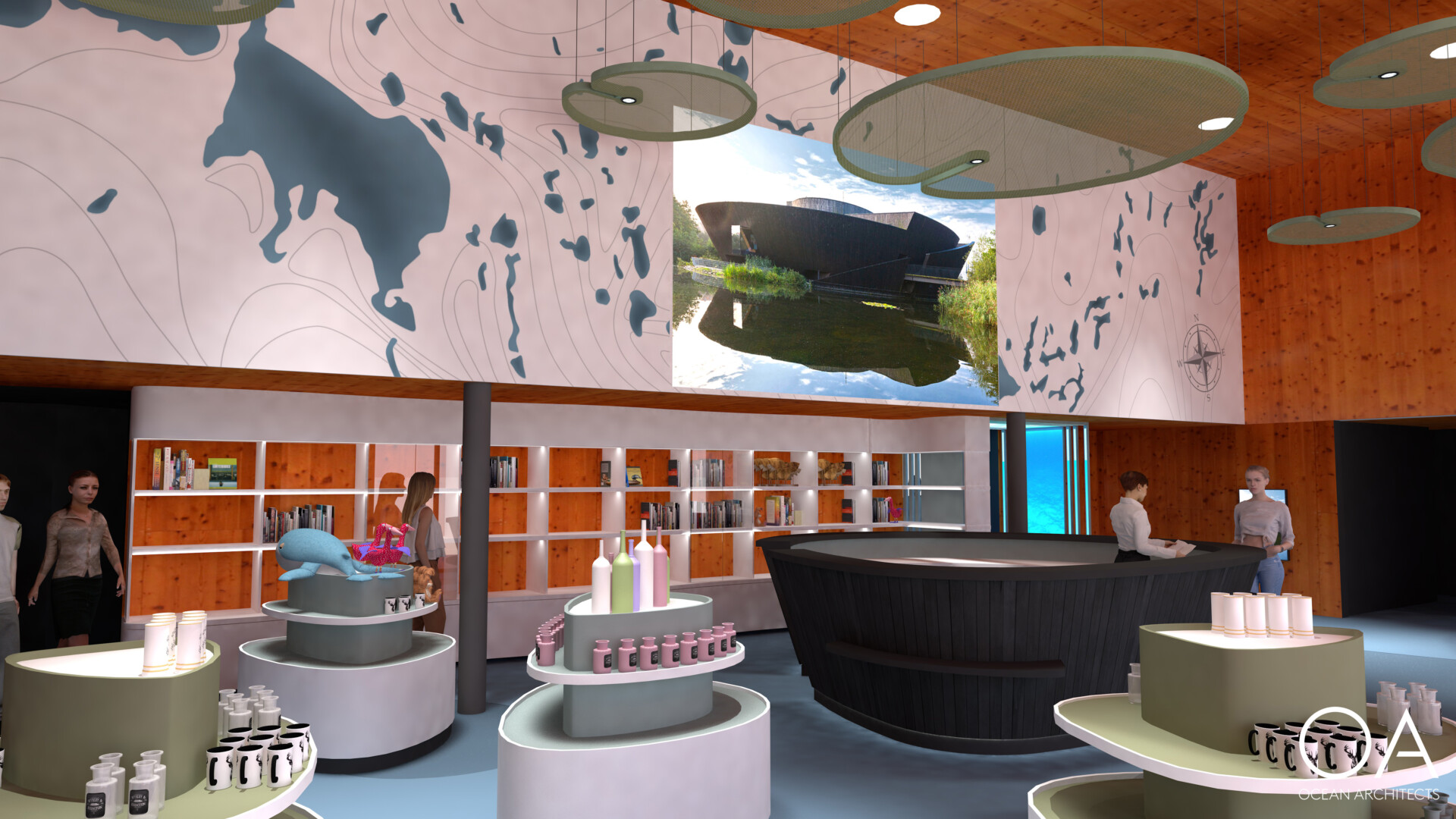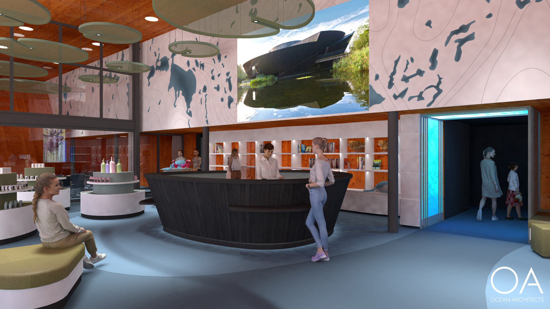 Die Rezeption als Hauptanlaufpunkt wird neu als Insel in Form des Müritzeums gestaltet. So erkennt man den besonderen Museumsbau auch innen wieder als „Haus im Haus“. Der Museumsshop erhält mit Shopinseln auf der Seenkarte des Bodens integriert und einem neuen großen Wandregal mehr Platz, um eine vielfältigere Auswahl an Souvenirs und regionalen Produkten anbieten zu können. Lounge-Möbel laden zum Verweilen und Planen von Ausflügen und Exkursionen in die Mecklenburgische Seenplatte ein.