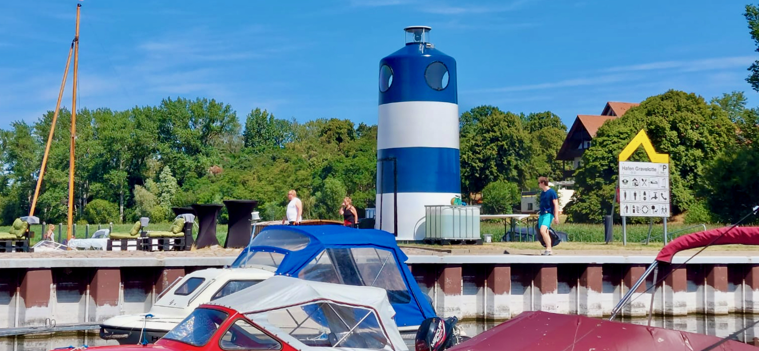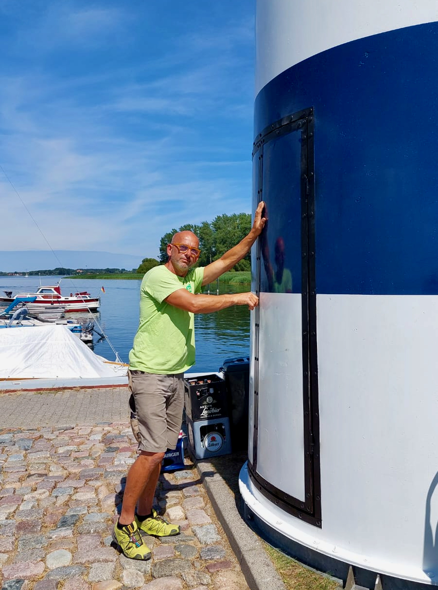 Was Eigeninitiative leisten kann, ist jetzt am Kummerower See im Norden des Landkreises Mecklenburgische Seenplatte zu sehen – ein neuer Leuchtturm weist Hobbykapitänen bei schlechter Sicht den Weg ans rettende Ufer. Gebaut hat ihn Uwe Fischer, der 53-jährige Hafenmeister und Platzwart in Gravelotte an der pommerschen Uferseite des zehn Kilometer langen Sees. „Damit haben Schifffahrer eine Möglichkeit, sich bei Sturm zu orientieren, aber auch die Retter“, betont Fischer, der aus der Region stammt. Der Hafenmeister hat – wie viele Leute seines Alters – mehrere Berufe. Gelernt hat er einst zu DDR-Zeiten in der Landwirtschaft, später machte er den Abschluss als Schlosser und als Schreiner. Für den 5,50 Meter hohen Leuchtturm hat er einen Getreidesilo genutzt und in Teilen umgebaut.