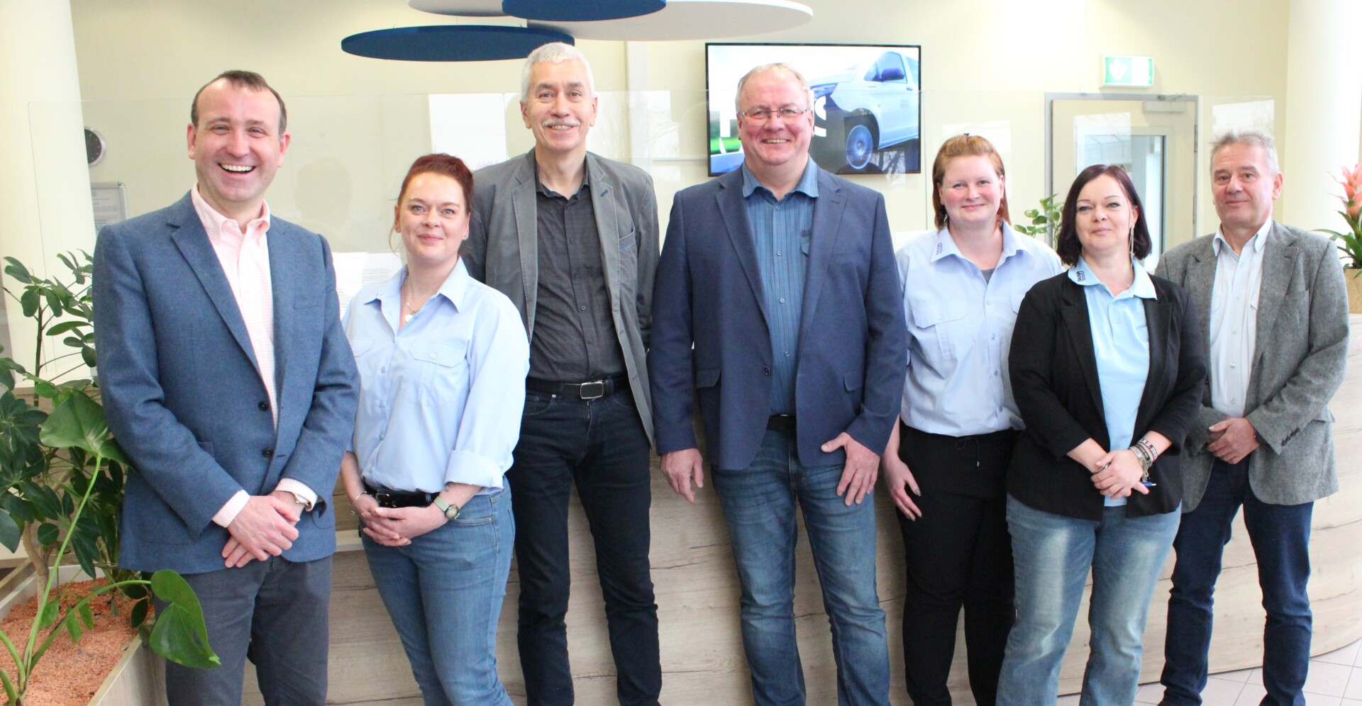 Bild: Stephan Bunge, Dirk Rautmann, Thomas Müller und Torsten Grahn (v.l.n.r) mit Mitarbeiterinnen der Mobilitätszentrale am Busbahnhof Neubrandenburg