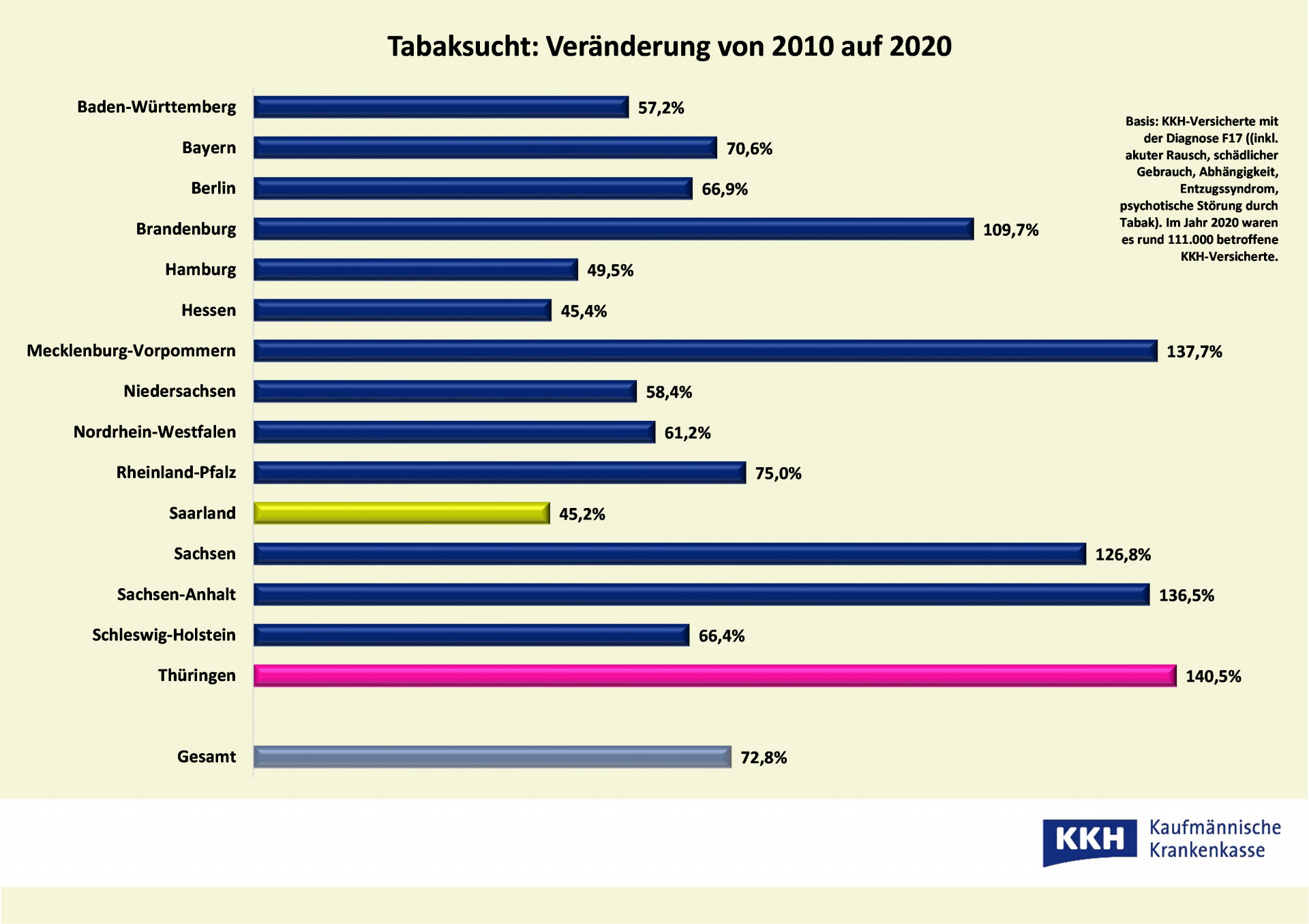 Der missbräuchliche Konsum von Tabak in Mecklenburg-Vorpommern nimmt weiter bedenklich zu. Das zeigen Daten, die die KKH Kaufmännische Krankenkasse zum heutigen Weltnichtrauchertag ausgewertet hat. Laut KKH-Hochrechnung wurden im ersten Corona-Jahr 2020 etwa 120.000 Menschen in MV wegen Tabakabhängigkeit, Entzugserscheinungen, eines akuten Tabakrauschs oder psychischer Probleme aufgrund von Tabak behandelt. Im Vergleich zu 2010 ist das ein Plus von fast 138 Prozent. Im Ländervergleich liegt der Nordosten damit auf dem zweiten Platz. Am kritischsten ist die Lage in Thüringen: Dort stieg der Anteil der Exzessiv-Raucher um 140,5 Prozent. Das geringste Plus verzeichnet die KKH hingegen mit rund 45 Prozent im Saarland.