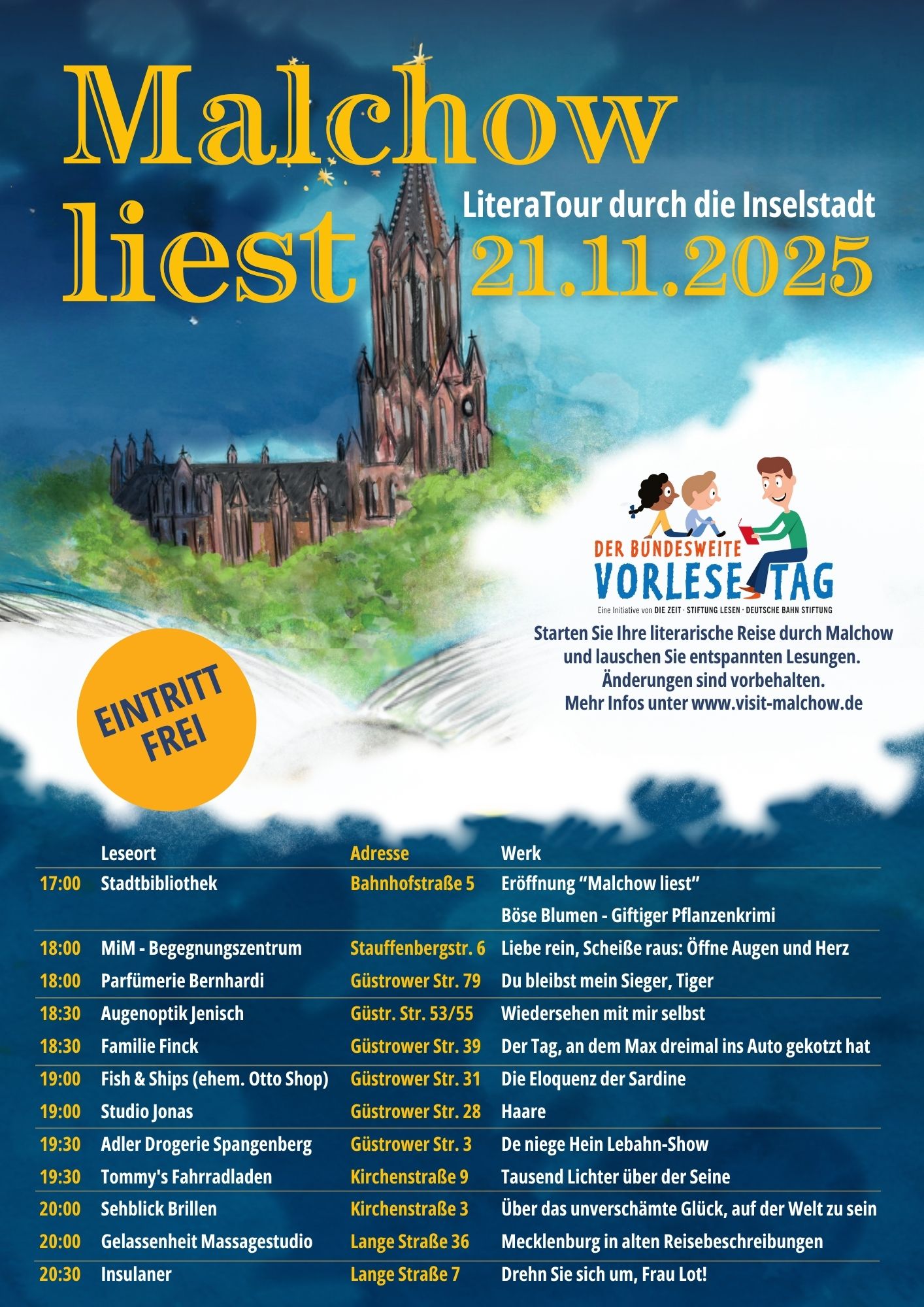 Lesen verbindet – und Vorlesen begeistert: Unter diesem Motto laden der Kultur- und Sportring e.V., die Stadtbibliothek Malchow, Malchower Geschäftsleute sowie weitere Gastgeber am morgigen Freitag, 21. November, wieder zu einem besonderen literarischen Abend-Rundgang durch die Malchower Innenstadt ein. An verschiedenen stimmungsvollen Orten öffnen sich Türen für Geschichten, Gedanken und Gespräche. Besucher können innehalten, lauschen, sich austauschen – und die Freude am Lesen in geselliger Atmosphäre erleben. Der Auftakt ist um 17 Uhr in der Stadtbibliothek, ab 18 Uhr folgen halbstündlich wechselnd weitere Leseorte.