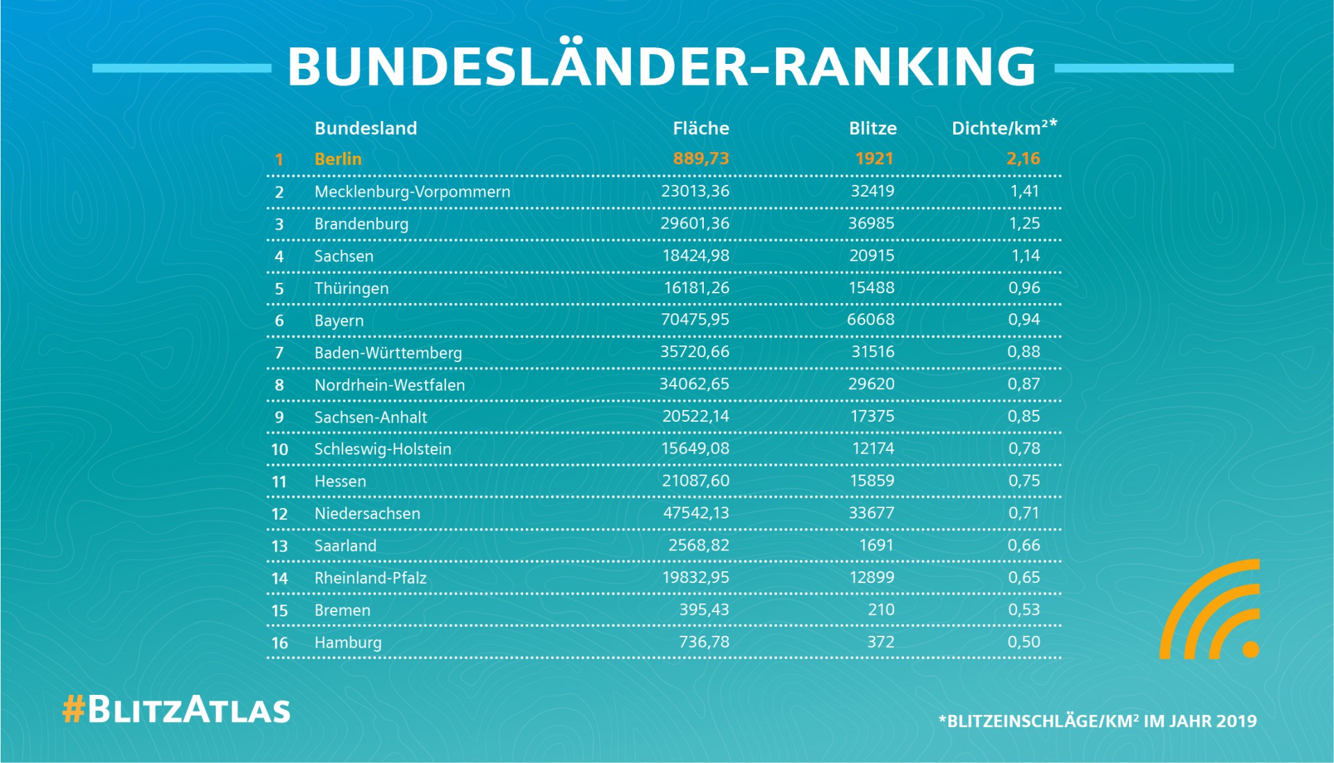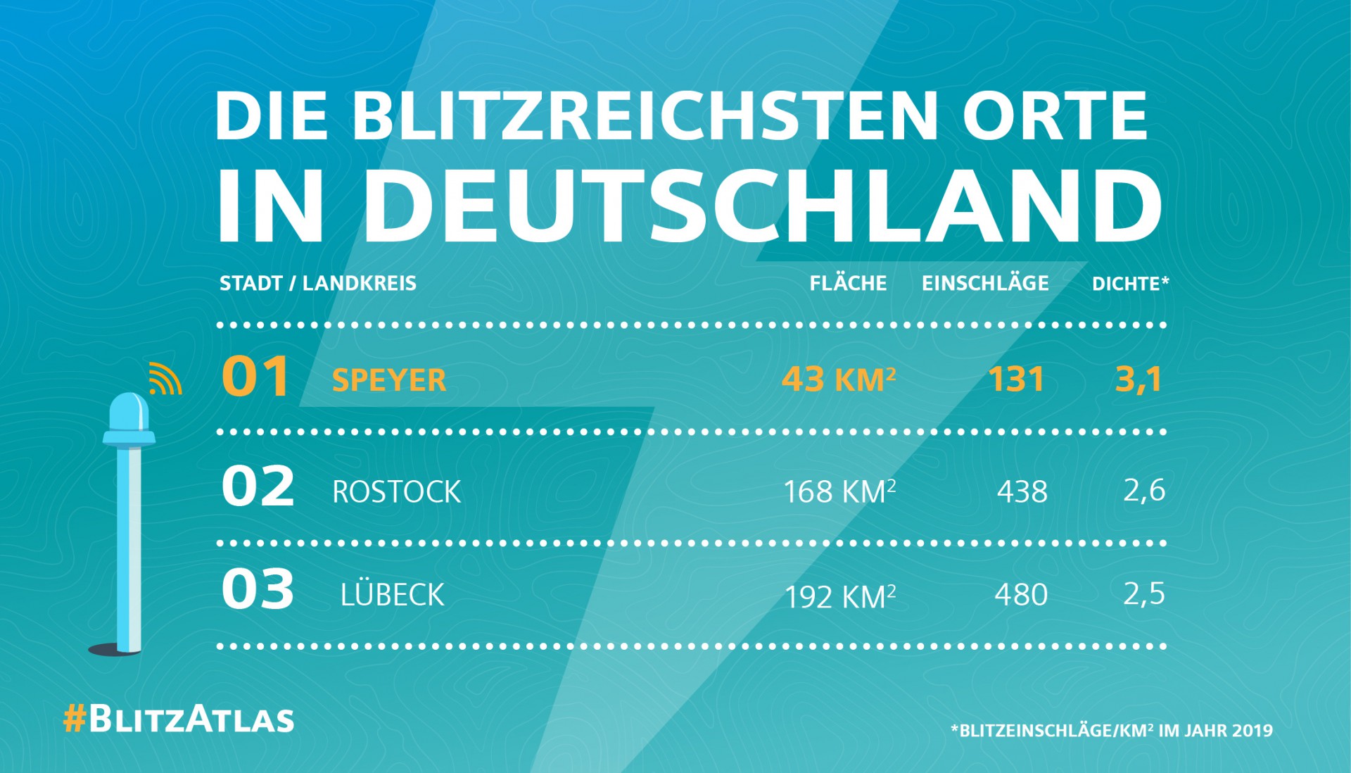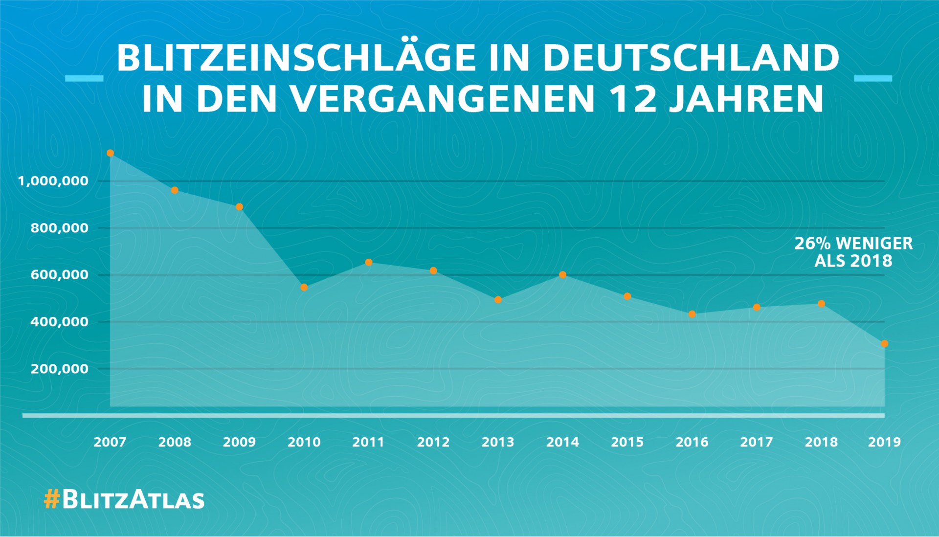 Bundesweit gab es nach Angaben des Blitzinformationsdienstes im vergangenen Jahr nur 329.000 Blitzeinschläge in Deutschland. Das sind 26 Prozent weniger als im Jahr davor. Grund dafür sei die Trockenheit, denn Gewitter benötigten Hitze und Feuchtigkeit. 2018 waren es noch 446.000 Blitze, 2007 sogar deutlich mehr als eine Million. Mit diesen Werten liegt Deutschland im europäischen Mittelfeld. Die niedrigsten Blitzdichten gab es mit 0,03 in Gebieten in Irland und Schottland. Die höchsten fanden sich im Länderdreieck Italien, Slowenien, Kroatien mit Spitzenwerten von 8 bis 10 Blitzen pro Quadratkilometer.